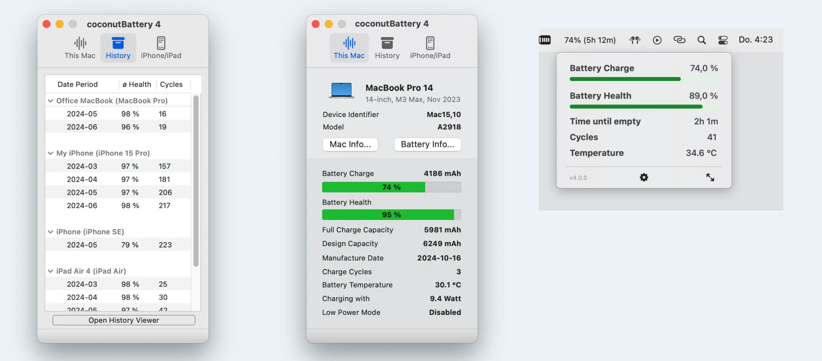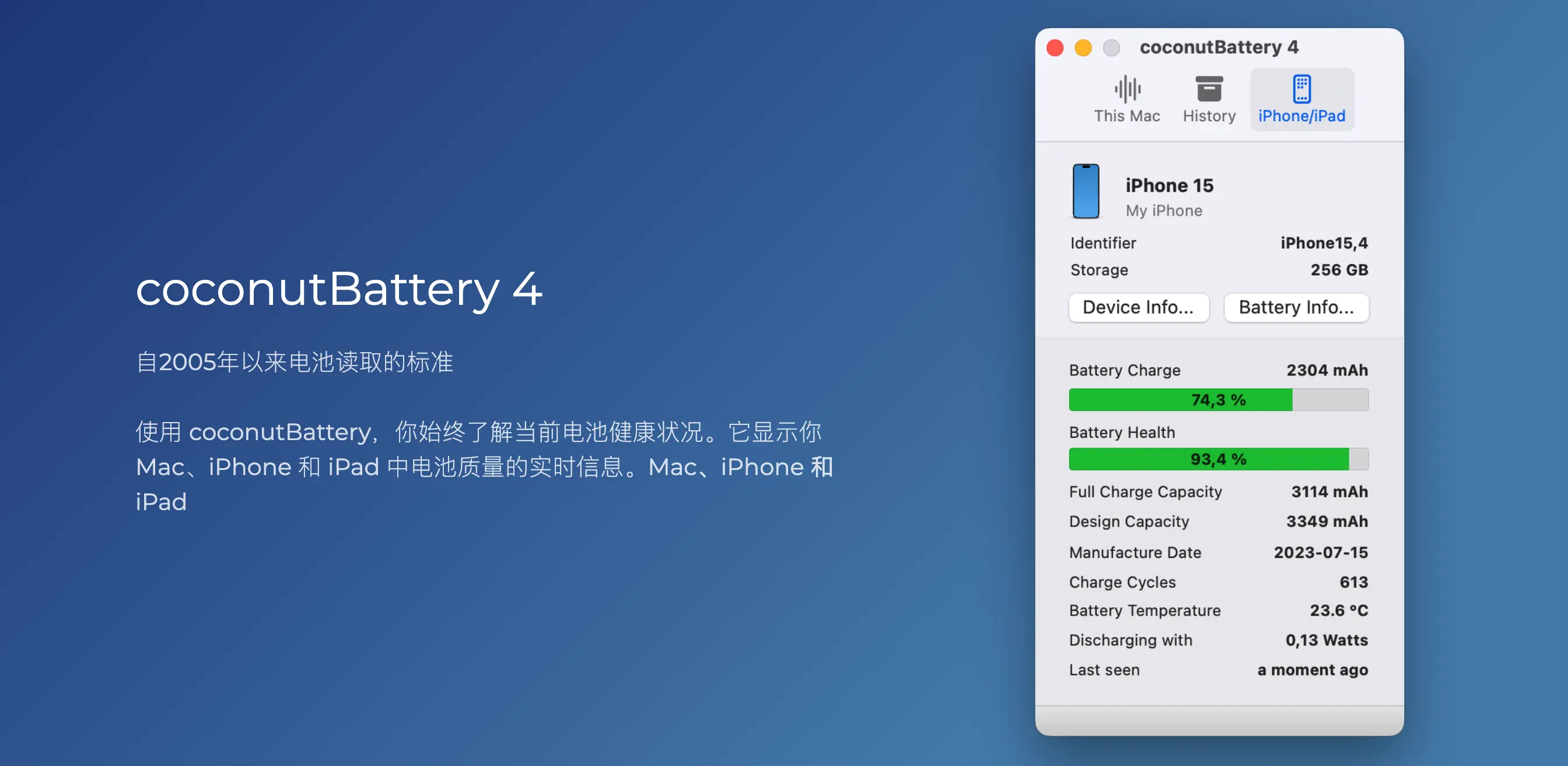 coconutBattery Plus是一款专为macOS用户设计的专业电池监控与管理工具,被誉为苹果设备的“电池健康专家”🔋。它能够提供Mac、iPhone和iPad电池的实时健康信息与详尽的历史数据记录,包括电量、电压、充电循环次数、温度等关键指标,并通过直观的数据可视化帮助用户全面了解电池状态、预测剩余寿命,从而有效延长设备续航时间。