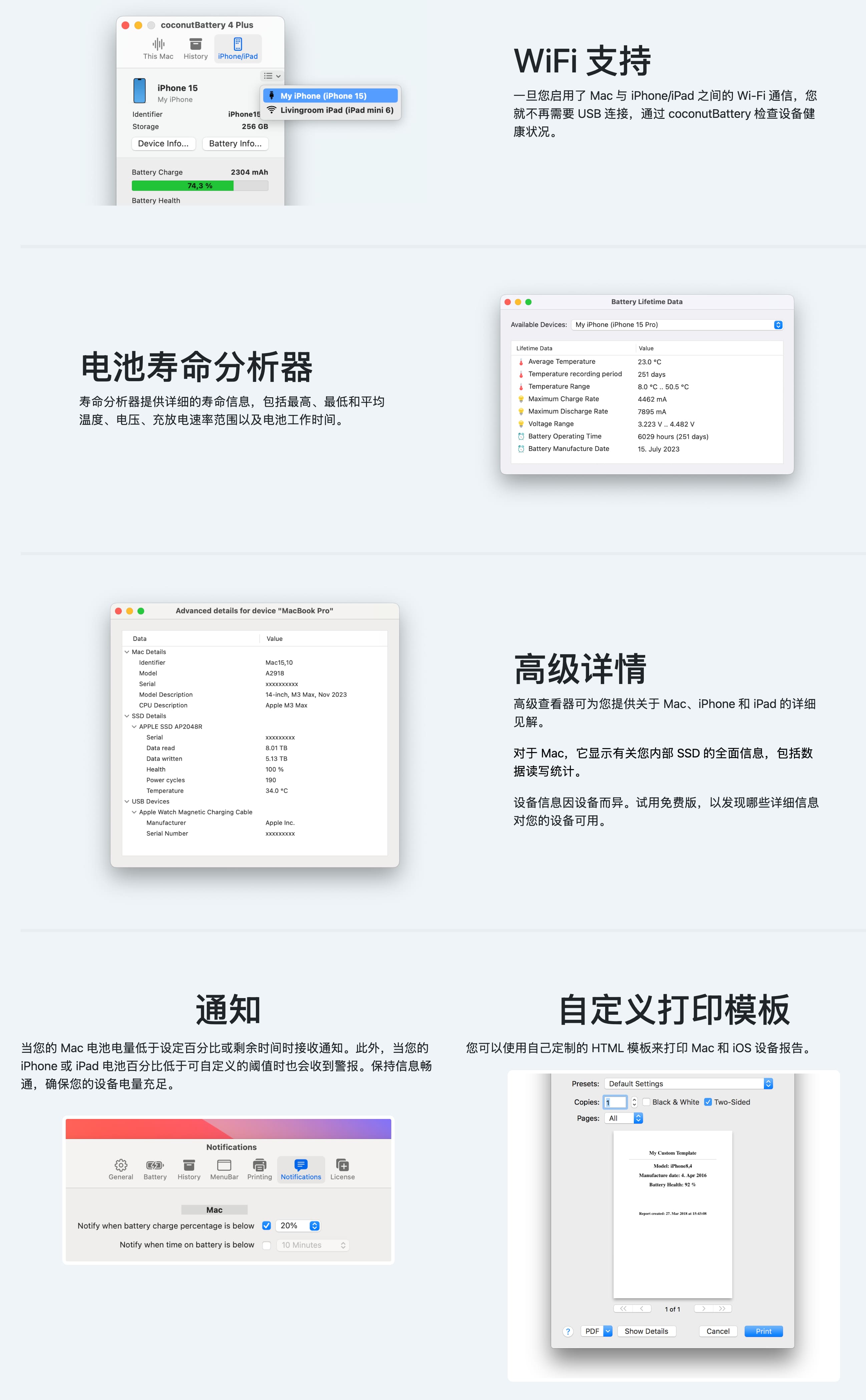 🖨️ 自定义报告导出(Plus功能):可以使用自定义的HTML模板来打印Mac和iOS设备报告,方便用户记录、分享或存档电池健康信息。