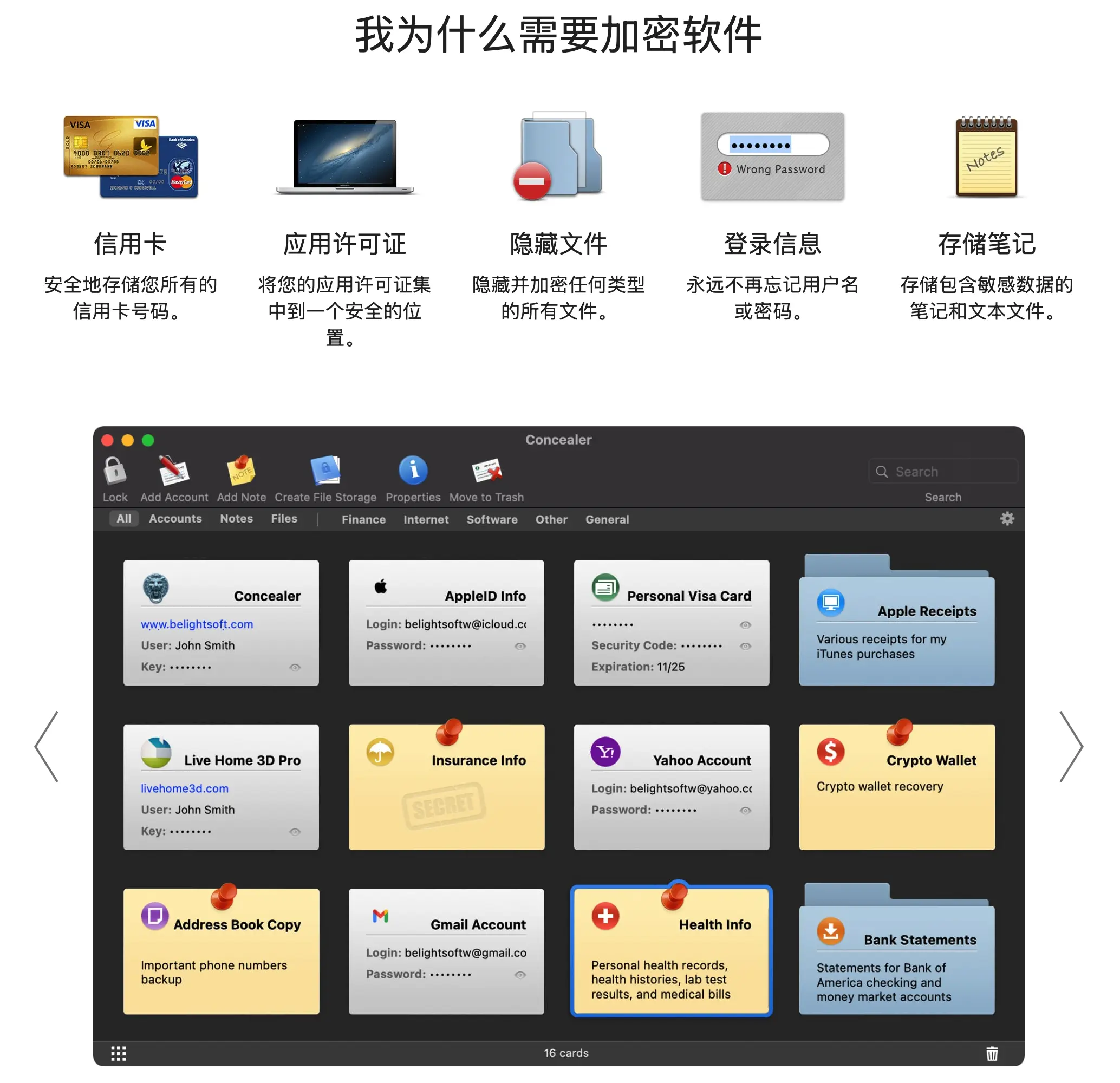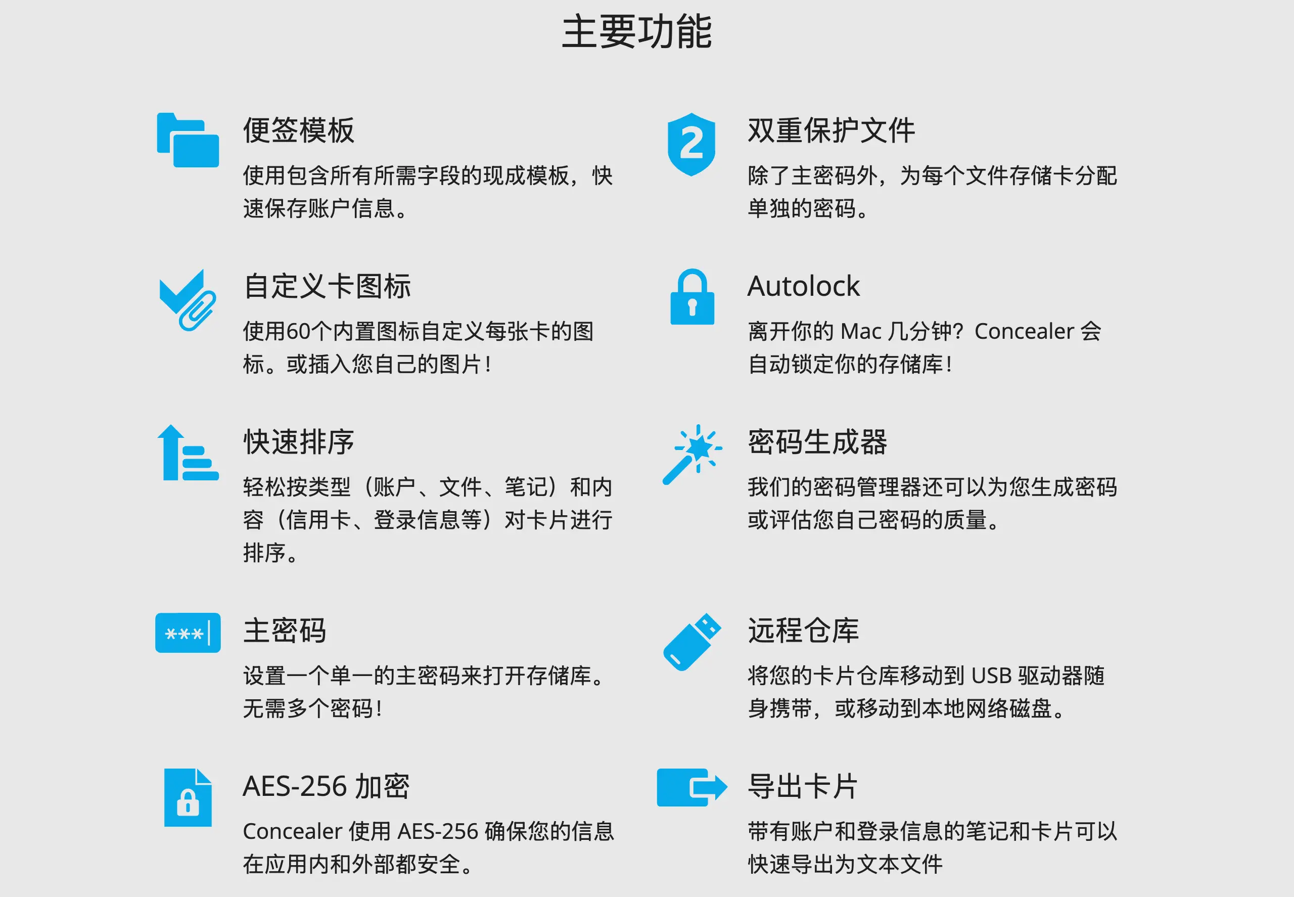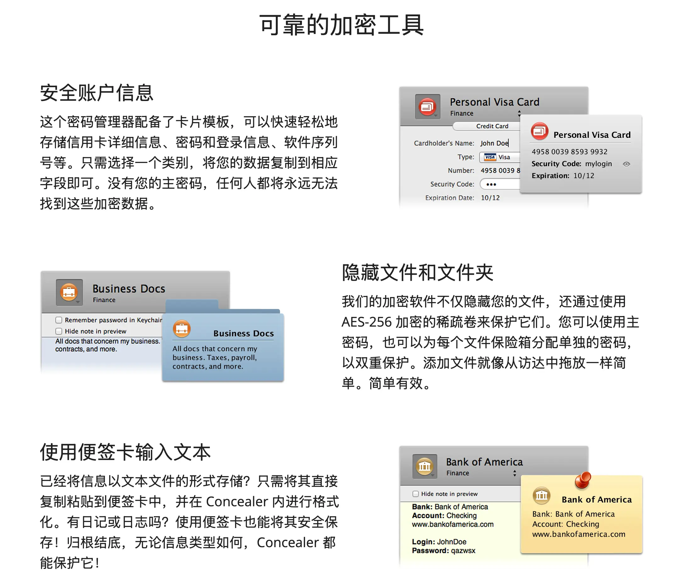 拥有大量敏感信息的用户: 需要安全地存储和管理多个网站的密码、软件许可证、信用卡信息等琐碎但至关重要的数据。Concealer的卡模板和AES-256加密保护功能为此量身定制。