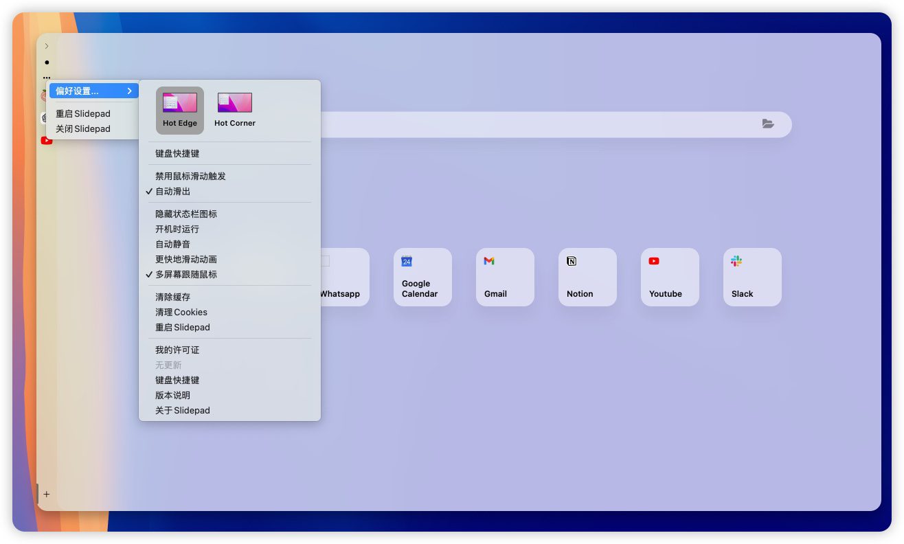 Slidepad for Mac重新定义了桌面多任务边界💡——这款革命性工具在屏幕边缘创建iPad式滑动侧窗🚀,将高频Web应用(如割麦网/Gmail/YouTube)转化为即触即用的“数字磁贴”✨。它突破传统浏览器标签限制,允许任意网站、PDF甚至本地文件以零切换成本悬浮操作,为Mac用户打造无干扰流工作区,彻底告别窗口堆叠焦虑。