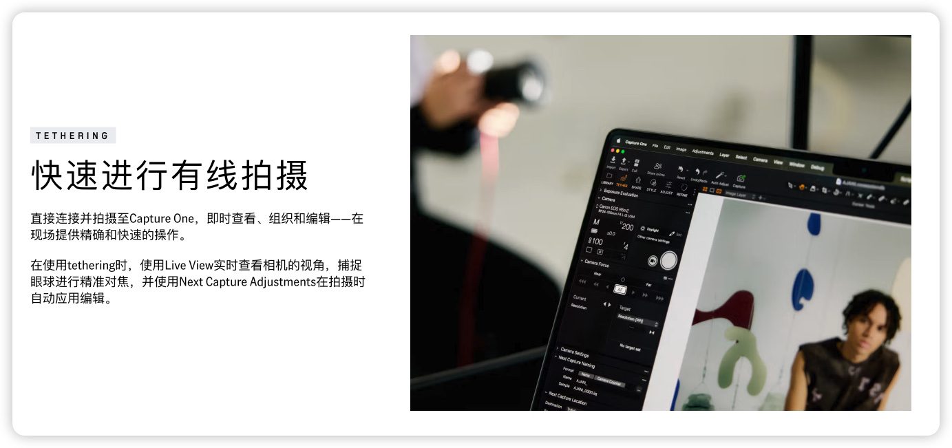 • ⚡️ 高效联机拍摄 直接控制飞思/佳能/尼康等中高端相机,实时显示拍摄画面并同步调整参数,简化棚拍流程。