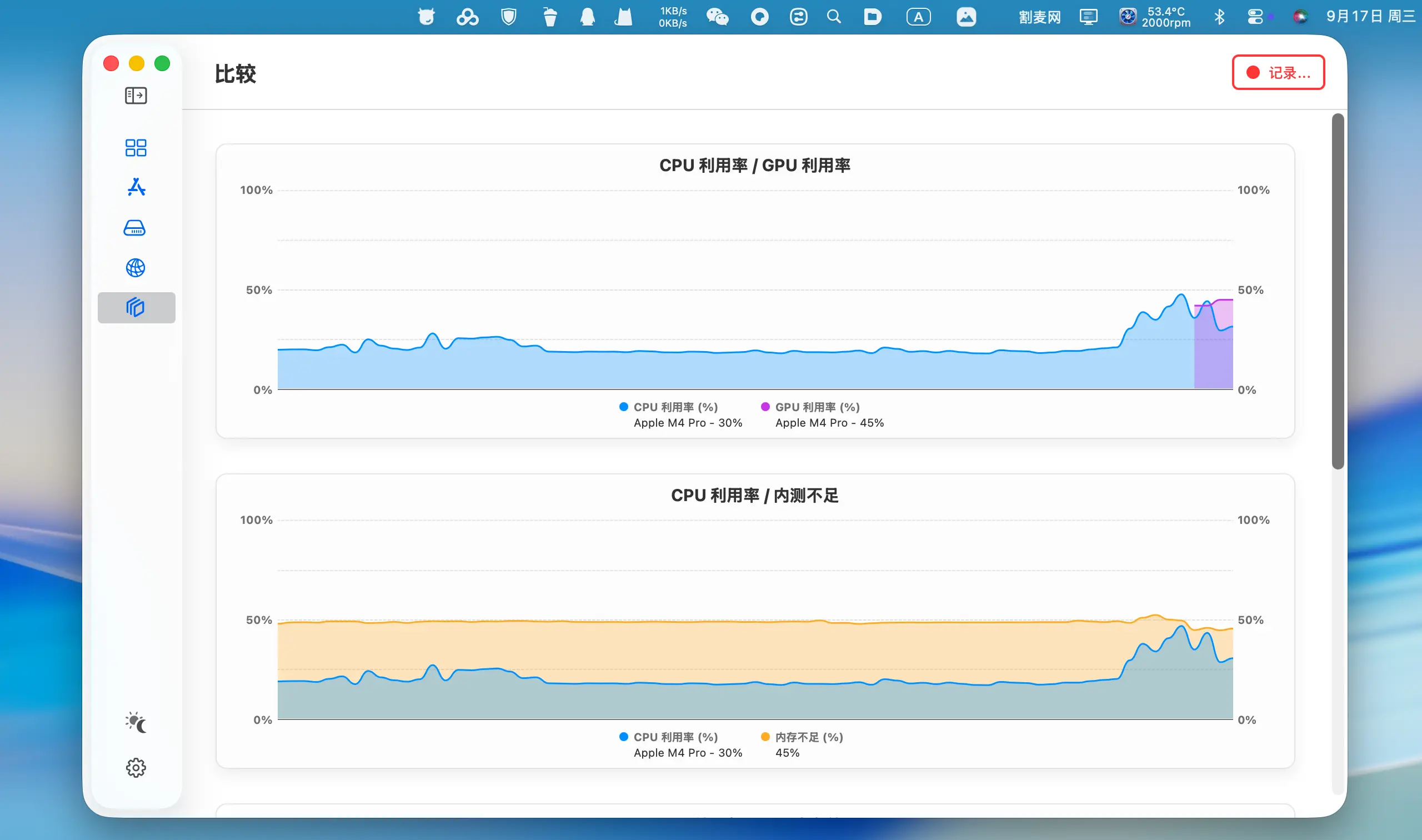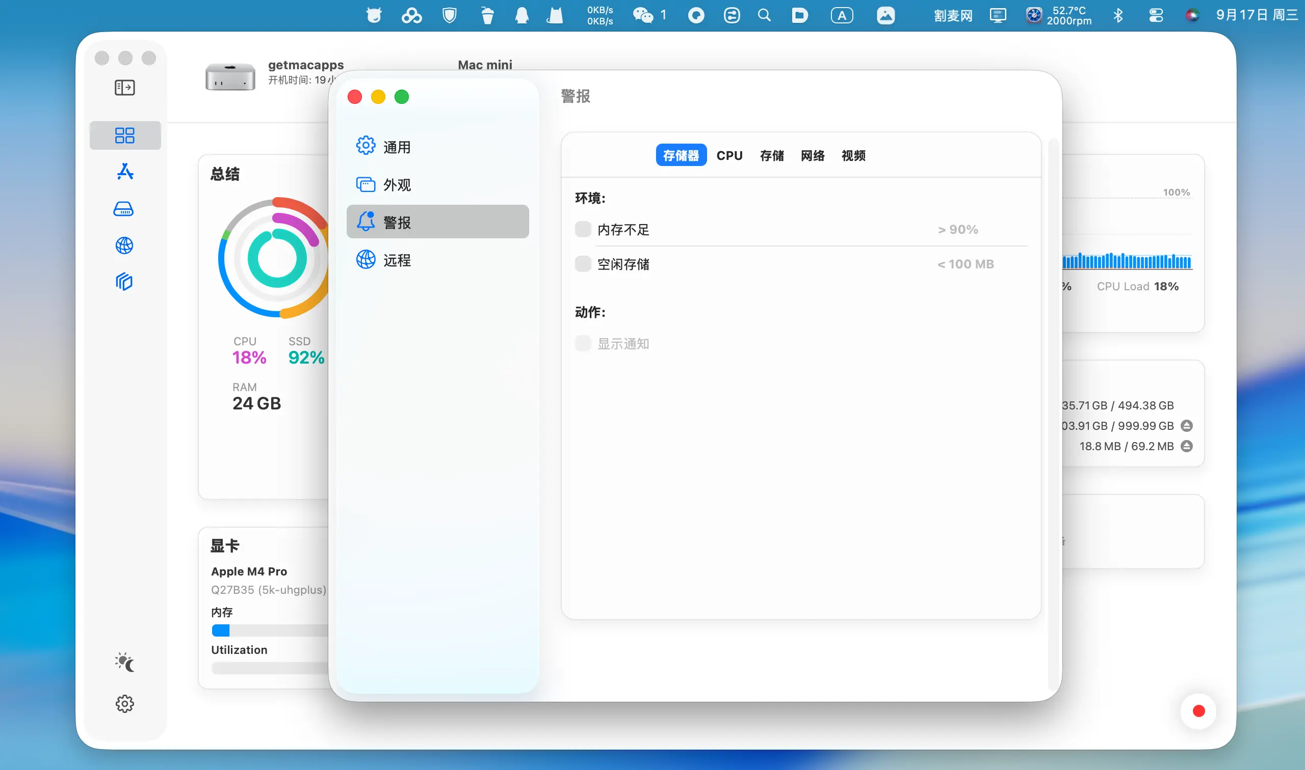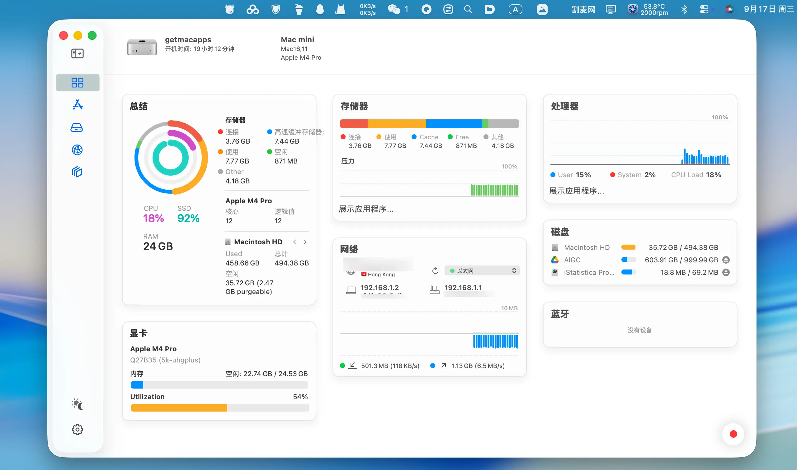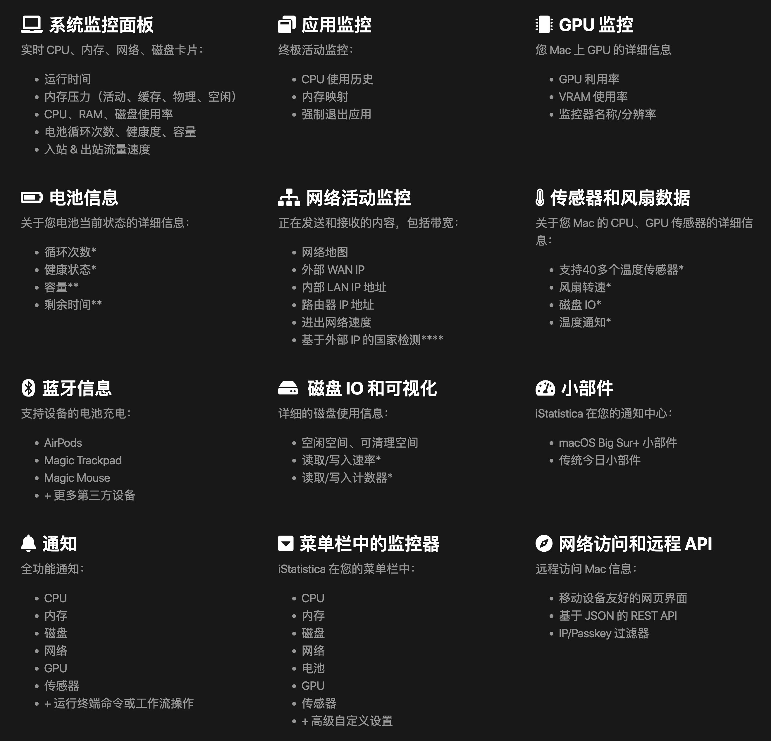 📊 全方位系统监控:提供完整的系统状态概览,实时显示CPU使用率、内存占用、磁盘活动、网络流量、电池状态和温度传感器数据,让您对Mac的运行状况一目了然。 -