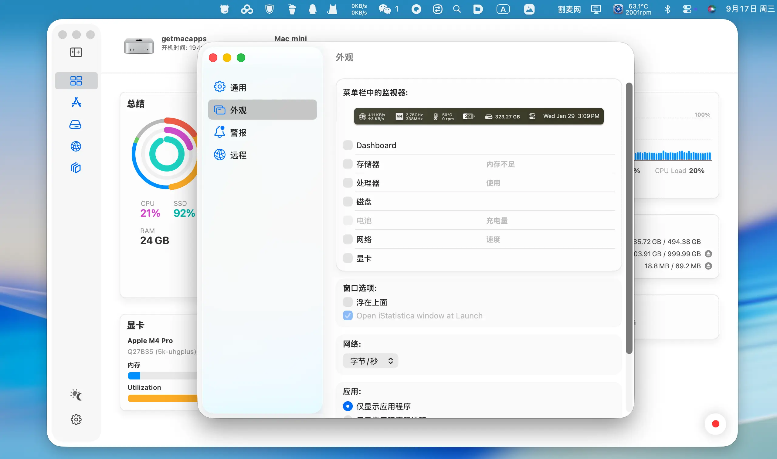 🎨 美观菜单栏集成:所有信息以简洁美观的方式集成在菜单栏中,支持自定义显示项目和外观主题,既实用又不影响桌面美观。