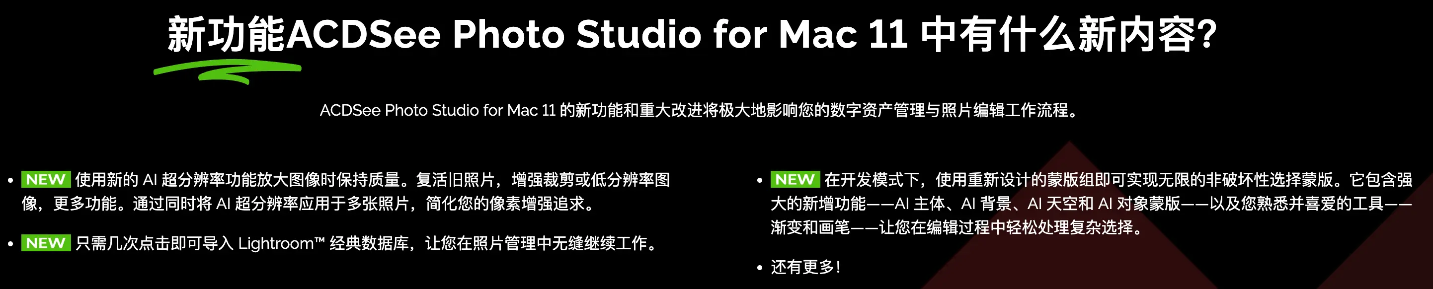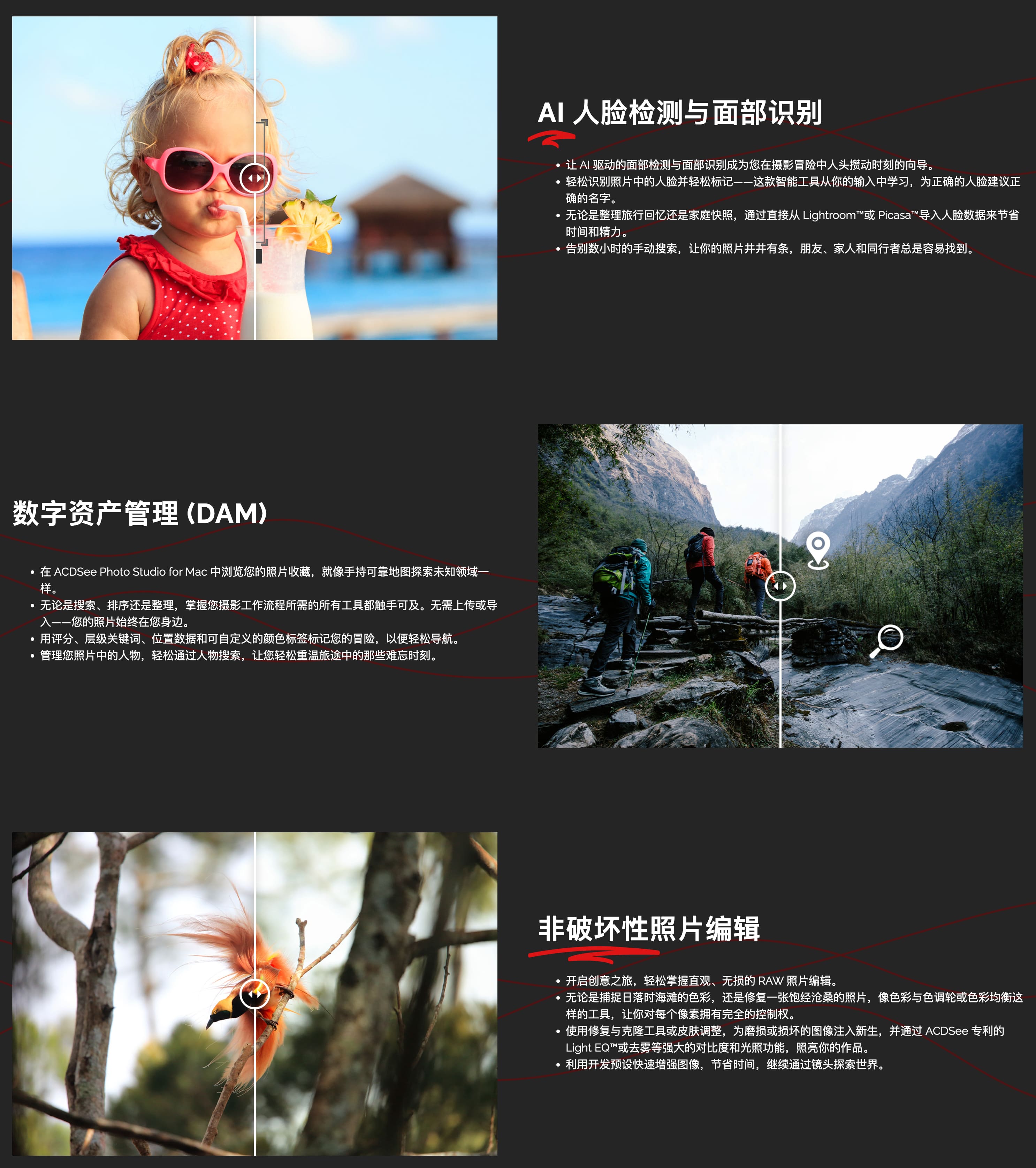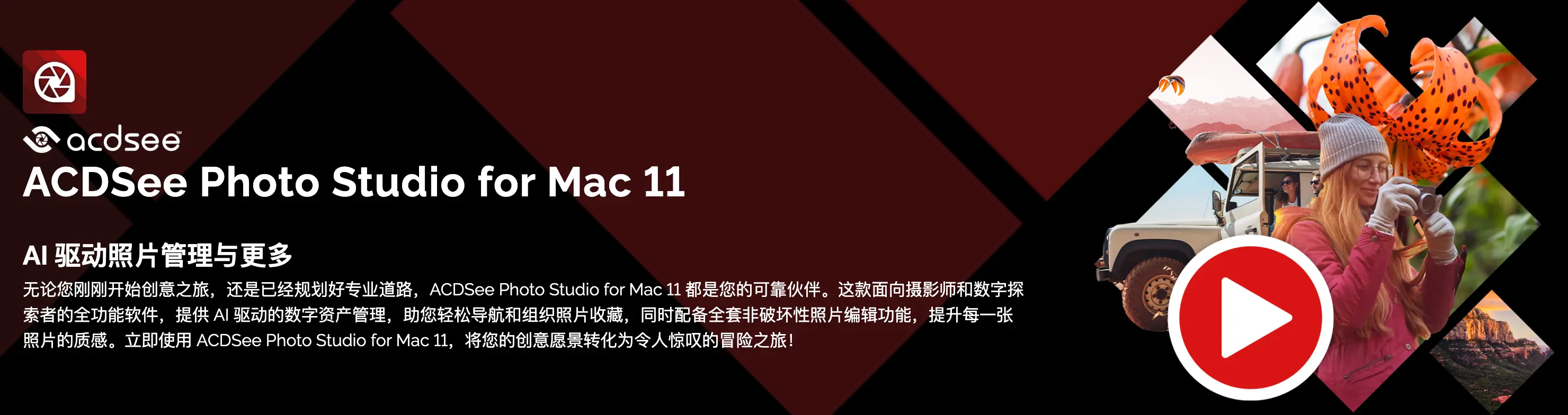 ACDSee Photo Studio for Mac 非常适合专业摄影师📸、摄影爱好者和数码创作者。无论是处理大量RAW格式照片、进行精准的AI辅助编辑,还是为作品添加版权水印和艺术边框,它都能提供强大支持。其高效的数字资产管理功能,尤其适合需要管理庞大图库的用户,帮助他们快速整理、搜索和分享作品。同时,软件与外部编辑器的无缝协作,也满足了需要多工具协同工作的复杂工作流程需求。