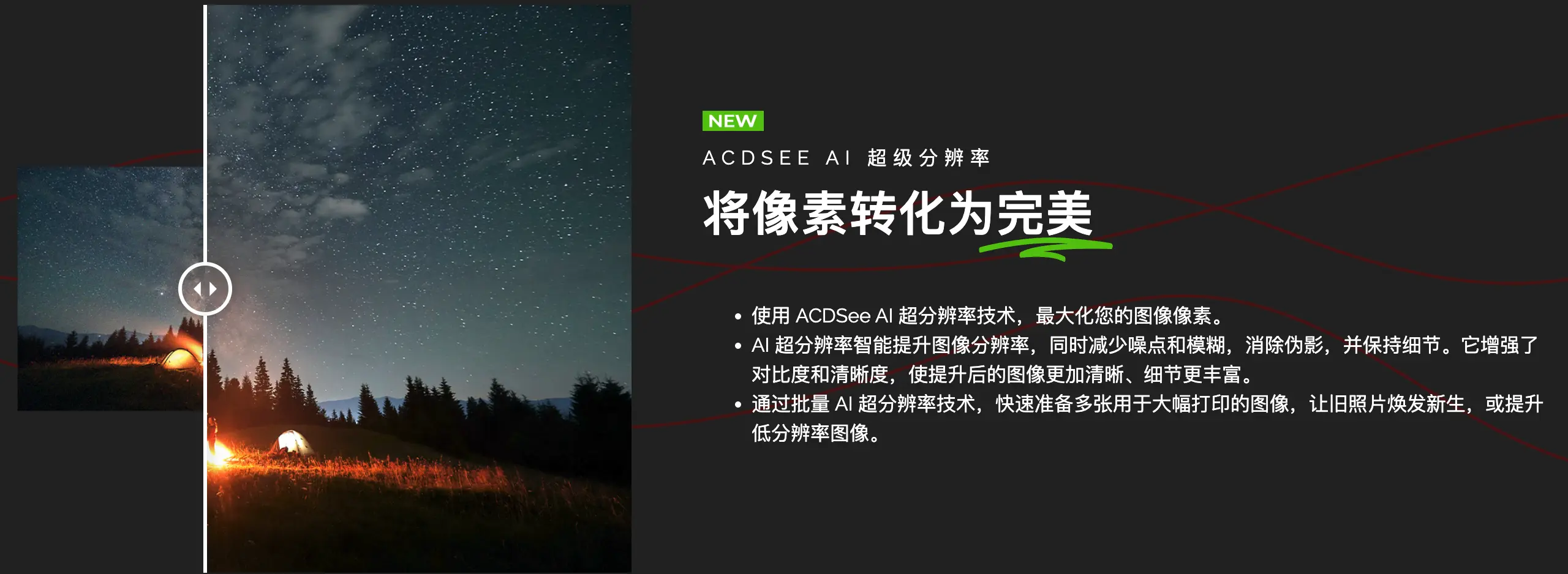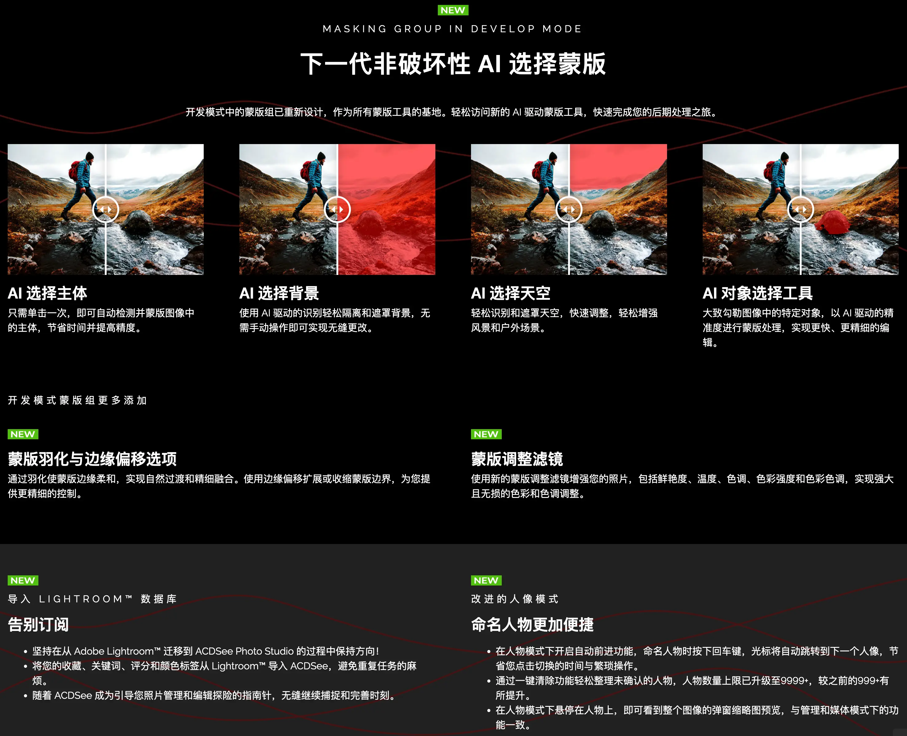 🤖 AI智能工具:搭载AI超分辨率功能,智能提升图像质量,减少噪点和模糊;AI蒙版工具(选择主体、背景、天空等)实现精准非破坏性编辑。 -