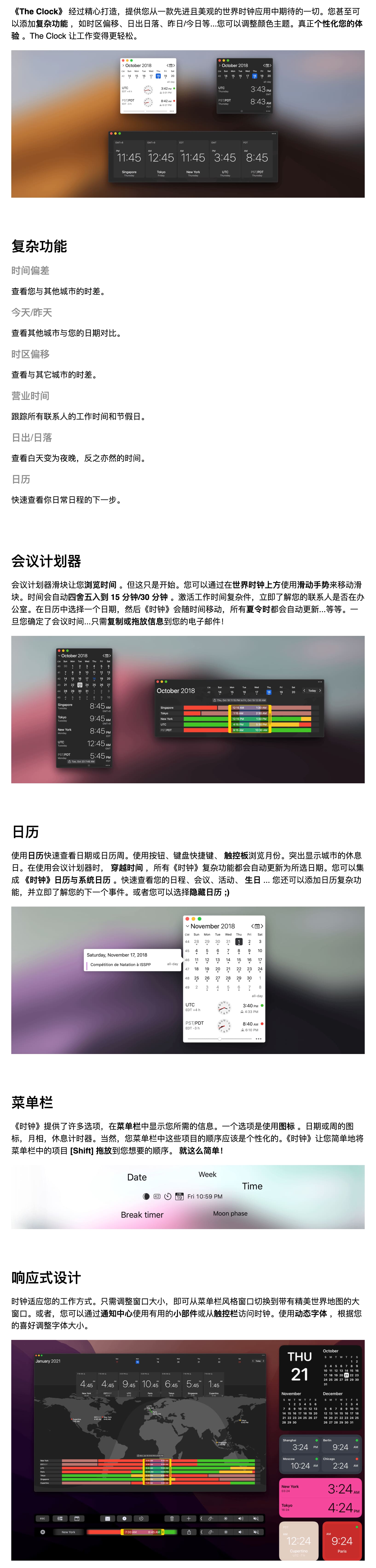 这款「The Clock」是一款专为macOS设计的精美菜单栏世界时间应用🕐,它不仅能够实时显示全球各地时间,还集成了日历、会议规划与个性化定制等高级功能,远超系统自带时钟。其核心差异化优势在于深度整合macOS生态系统,支持与系统日历无缝同步、提供Touch Bar与通知中心小组件支持,并能通过高度自定义的主题和时区细节显示,为跨时区工作者与团队协作提供极致便利。