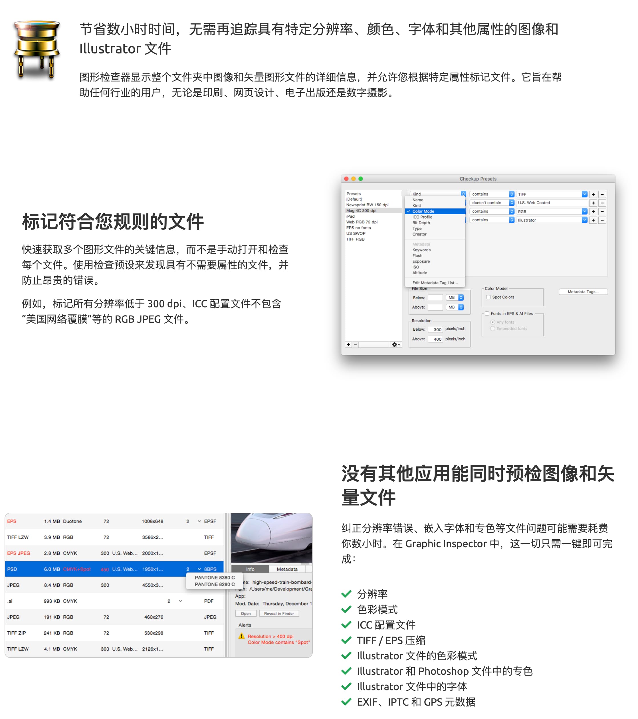在图形设计工作中,如何快速确保上百个文件的色彩、分辨率都符合印刷要求?🎨 对于Mac用户而言,Graphic Inspector正是您不可或缺的图形文件质检专家!这款专业的检查工具能为您批量分析图像和矢量文件的详尽属性,并通过智能规则快速定位潜在问题,让设计师和印前操作员彻底告别繁琐的手动检查,有效避免代价高昂的输出错误。✨