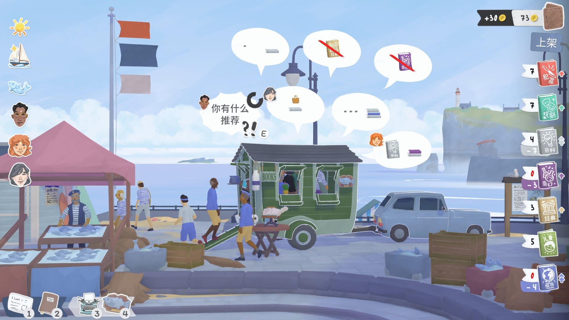 根据不同地点顾客的喜好,精心挑选书籍种类堆满书架。向来访的顾客推荐合适的书,满足他们的需求。游戏内书目均基于真实出版物,并专为中文版本进行了本地化适配,精心挑选大量来自中文出版领域的图书,让你在虚拟书店中也能读到熟悉又意外的作品。