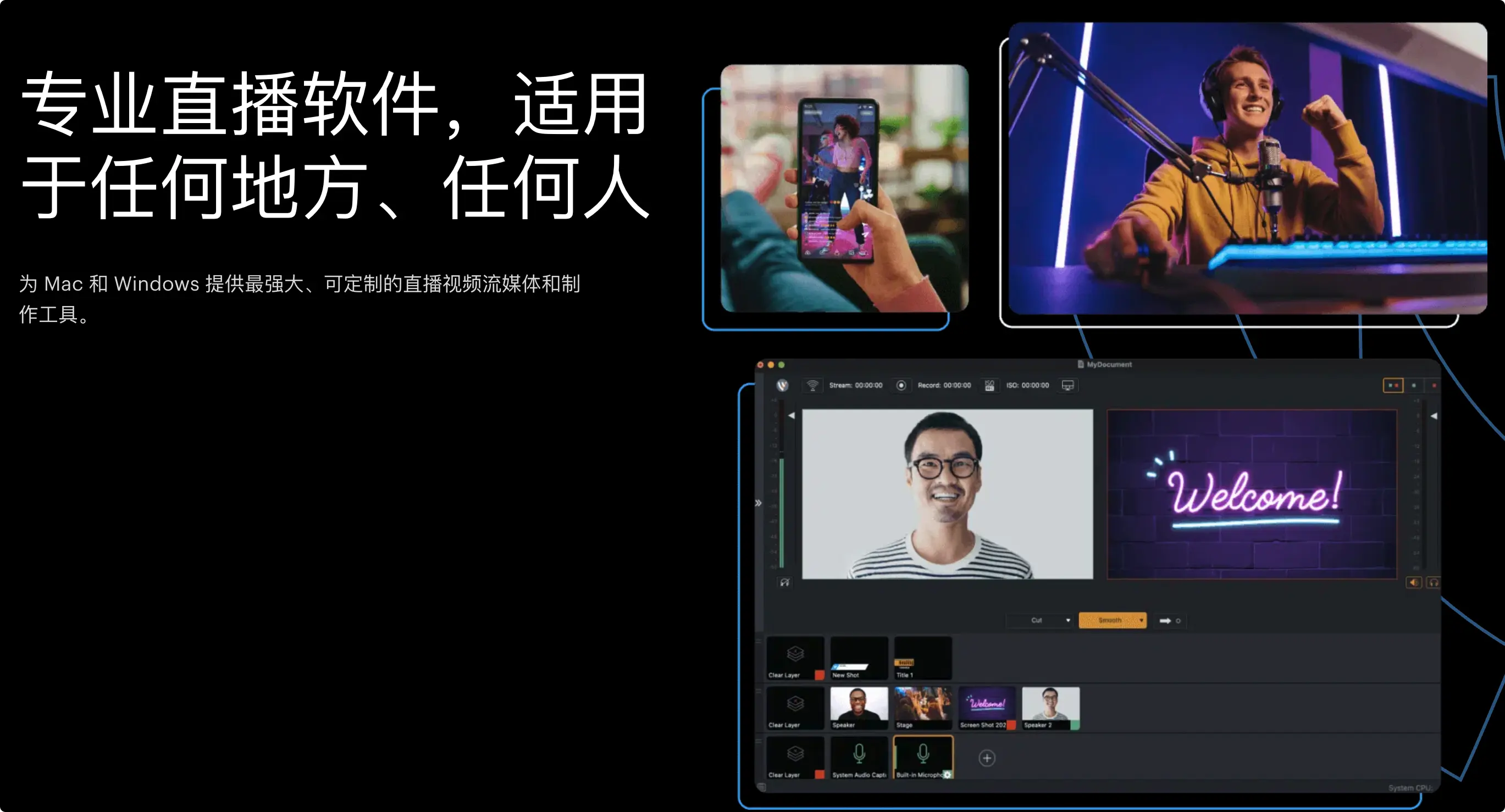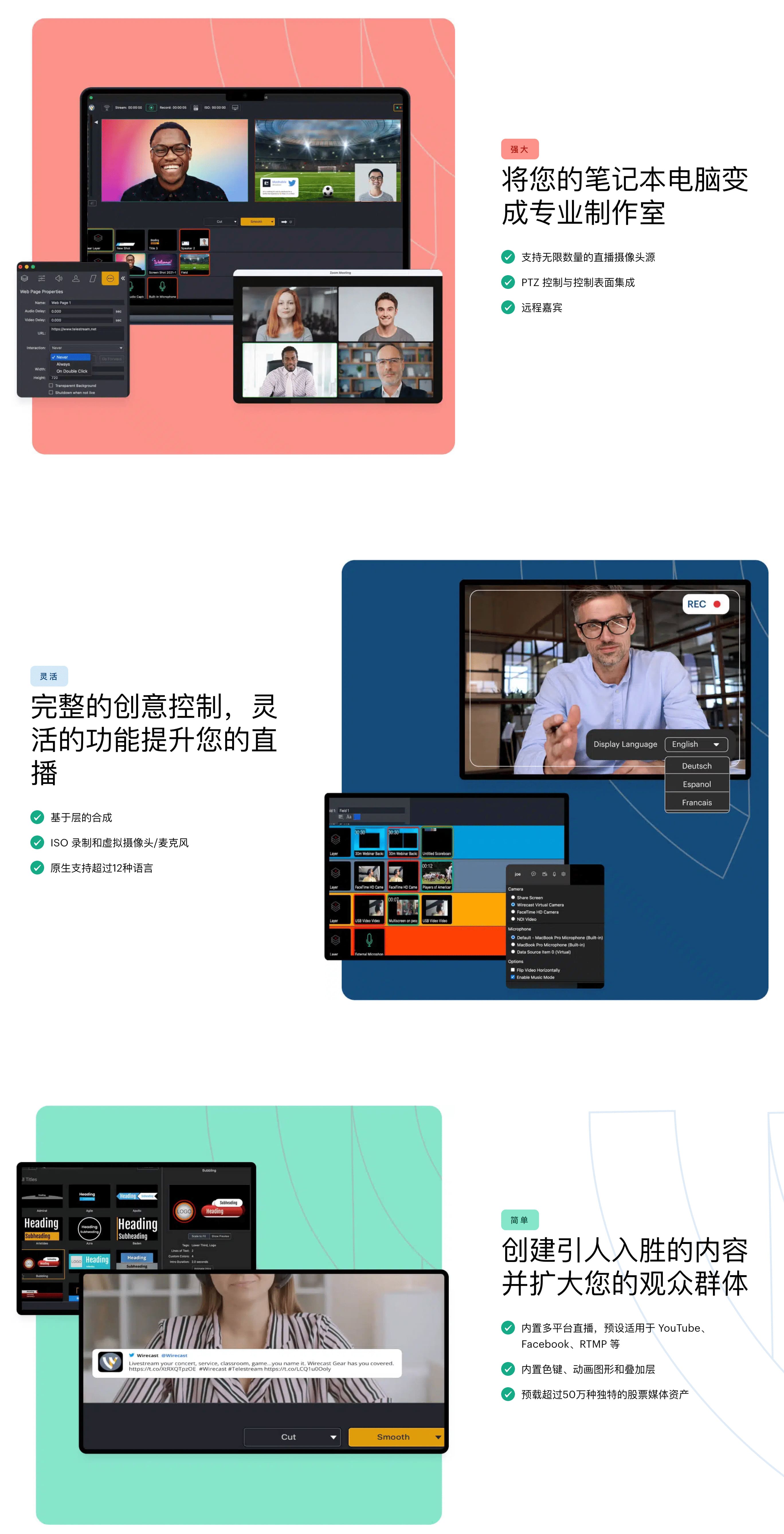 这款支持多平台直播推流的Mac视频制作工具是一款真正的多面手,它能完美胜任线上教育、企业会议、产品发布、体育赛事以及教会服务等多种场景的直播制作需求。无论您是需要多机位切换的专业直播团队,还是追求高效与高质量内容的个人创作者,它都能帮助您稳定可靠地制作出吸引眼球的广播级内容,实现专业的多平台同步直播推流。