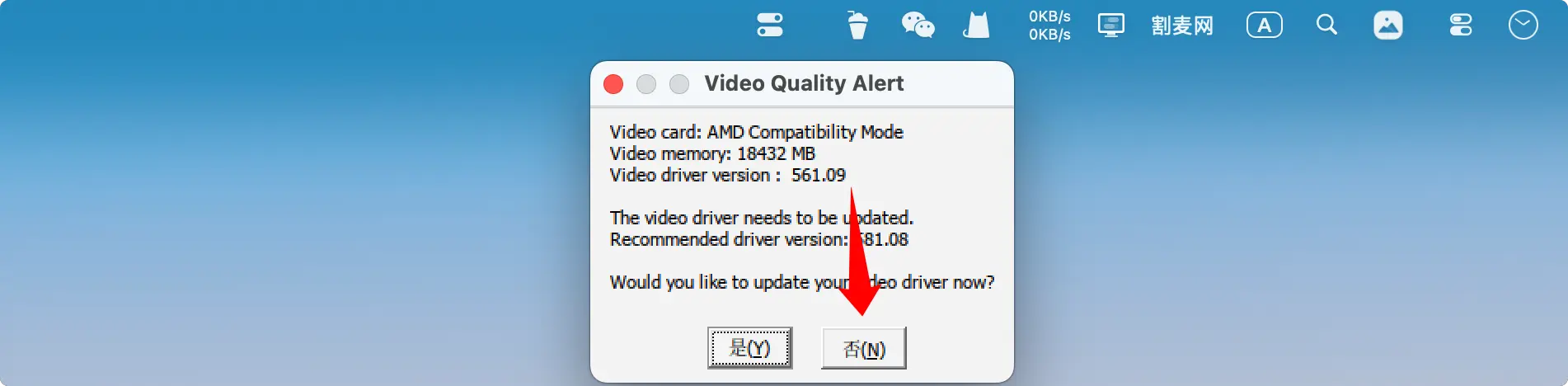 游戏启动时会弹出警告,提示图形驱动有已知问题并要求更新。直接点“否”忽略即可。
