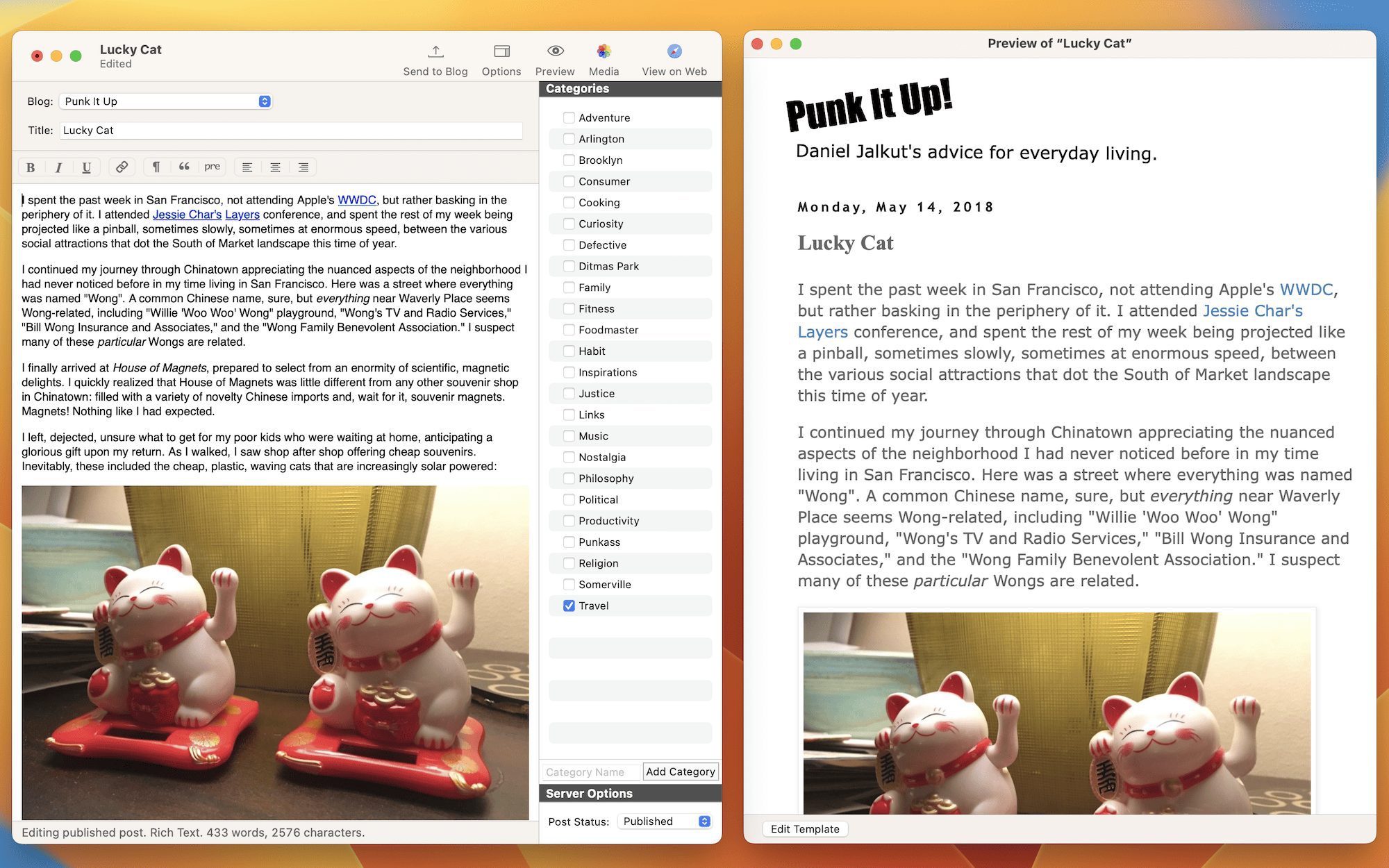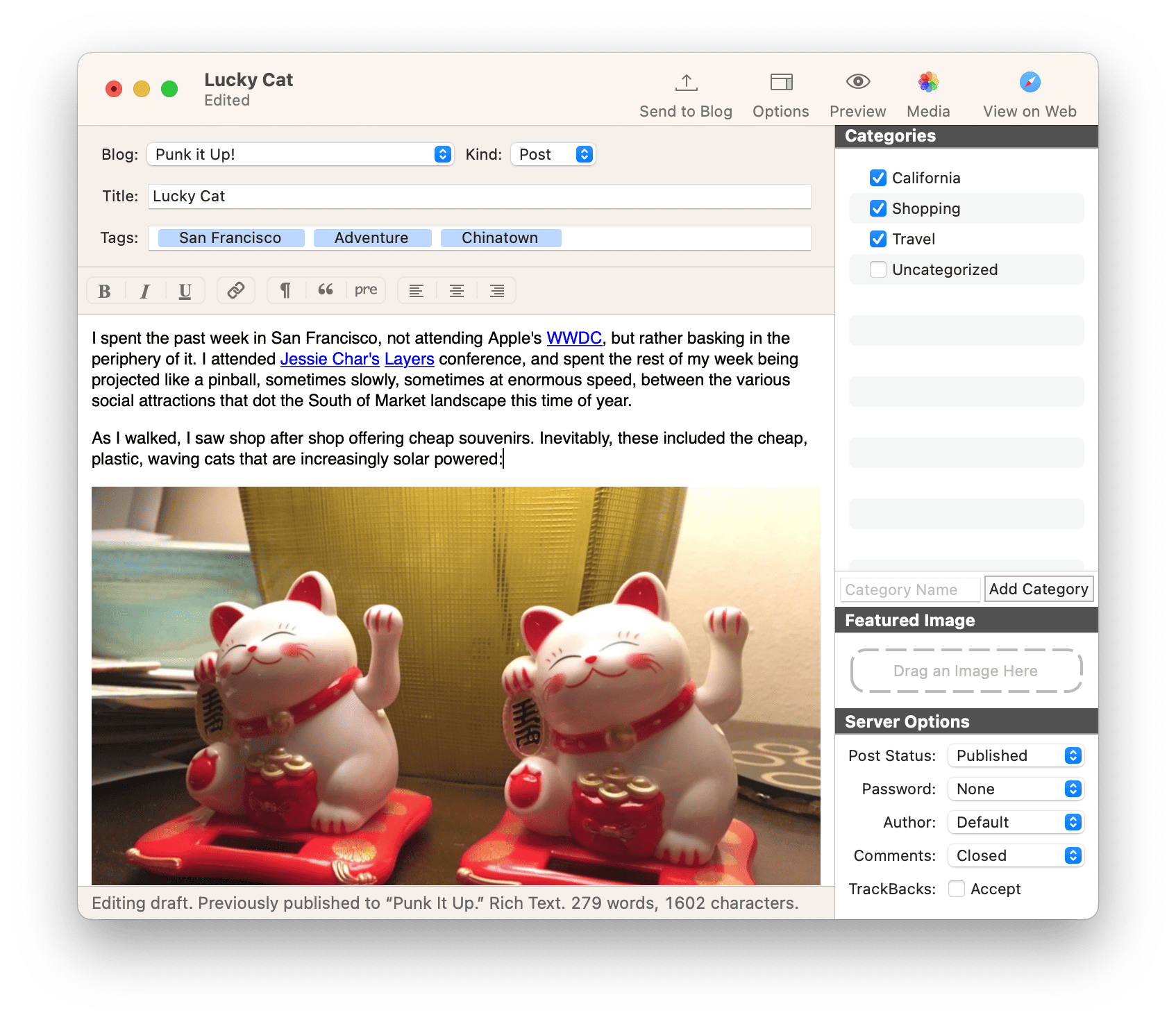 💡 小技巧:您可以使用 MarsEdit 的“发布稍后”功能来规划内容日历。提前写好多篇文章并设置不同的未来发布时间,这样可以保持您的博客更新频率稳定,即使在忙碌或休假期间也能自动发布新内容!