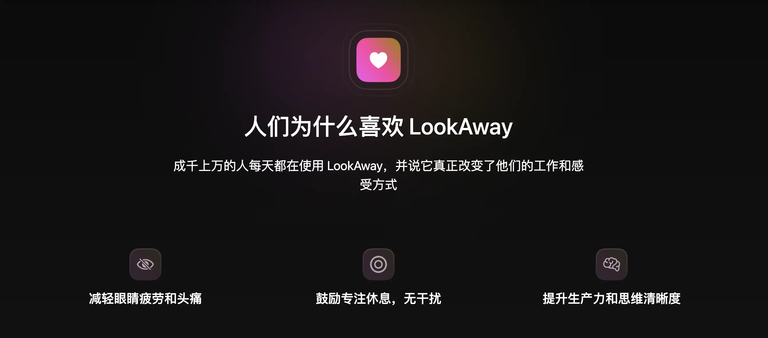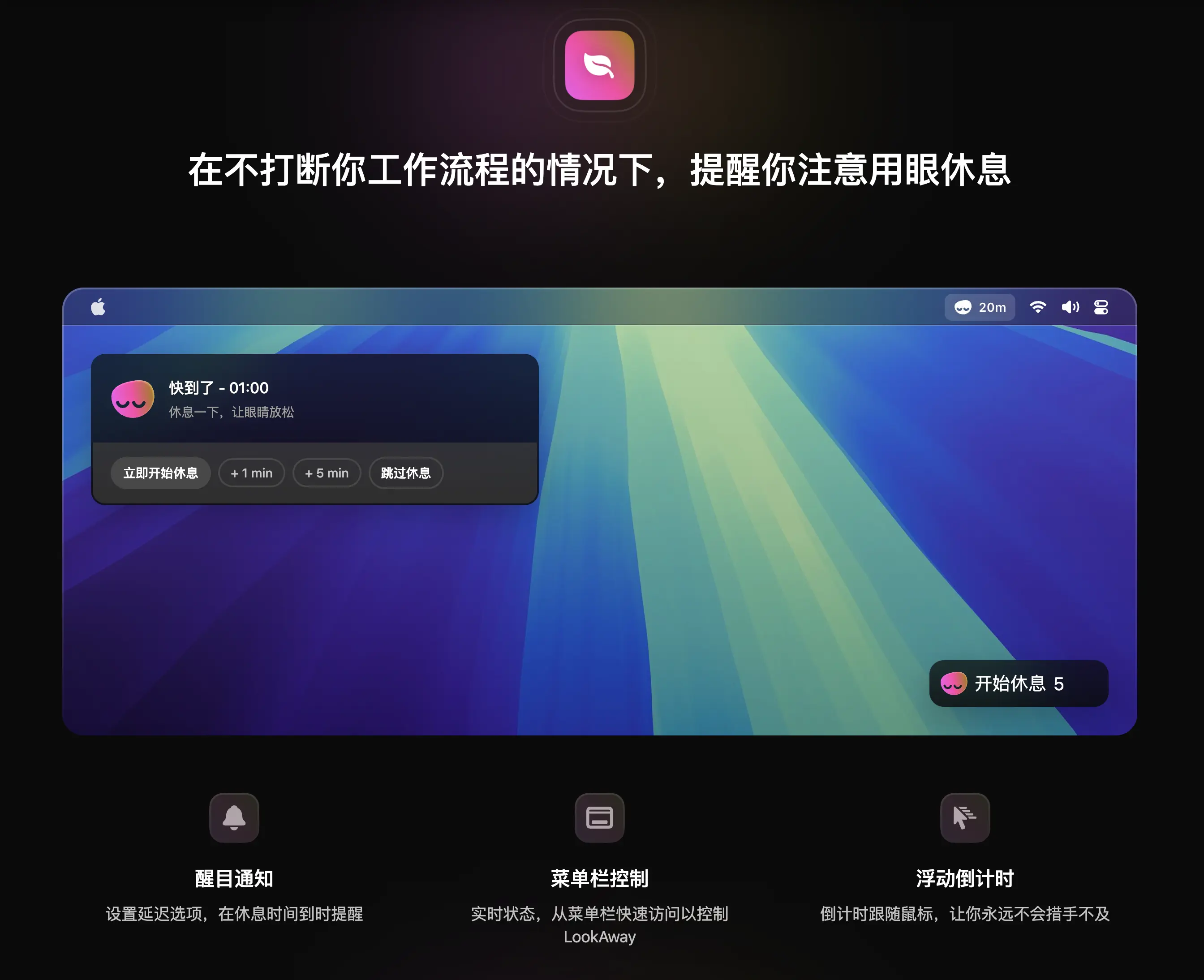 在数字时代持续用眼已成健康隐患👁️,LookAway 作为macOS专属护眼助手,通过智能化的情景感知休息提醒重塑科学用屏习惯✨。它不仅支持完全自定义短休/长休间隔,更具备会议检测、空闲暂停等自适应功能,在多屏场景下无缝守护视觉健康,让「20-20-20护眼法则」真正落地执行,堪称数字工作者的必备Mac护眼软件