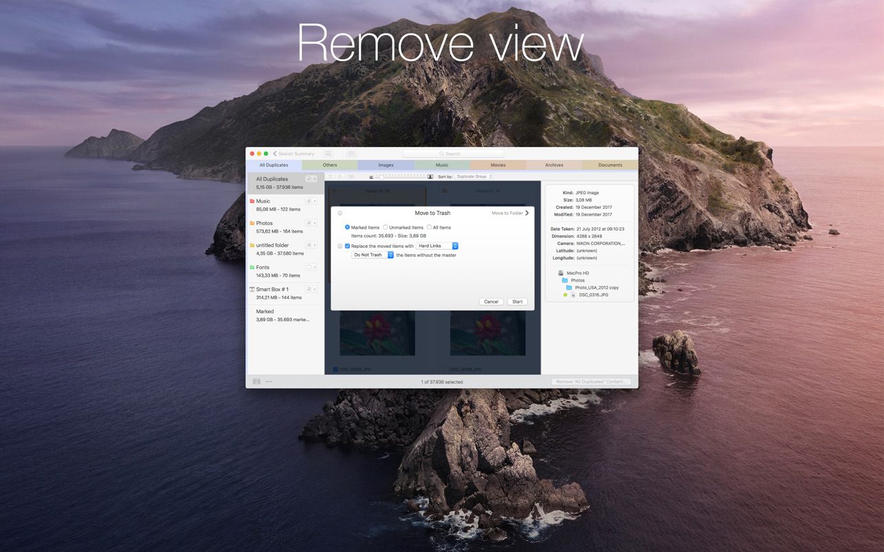安全的文件管理与预览:内置安全机制确保至少保留重复组中的一个文件,提供全尺寸文件预览,并支持将文件移动至文件夹、替换为别名或硬链接等多种操作。