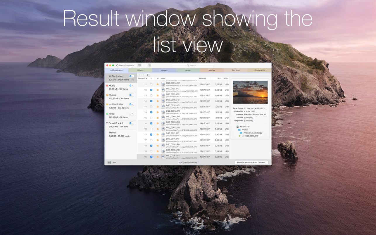 应用深度集成与支持:可搜索Photos、iPhoto、Aperture、iTunes及Mail邮箱等应用内数据库,并支持在Lightroom、照片、iTunes等应用程序中直接搜索和比对多个资料库。 -