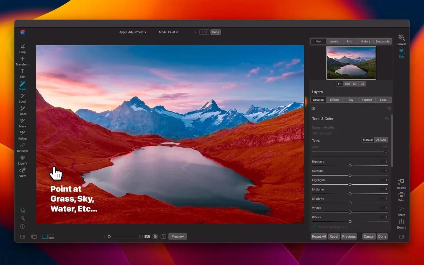 🤖 尖端AI工具集:内置Brilliance AI智能优化色彩色调,NoNoise AI高效降噪,Super Select AI精准识别对象创建选区,大幅提升编辑效率 -
