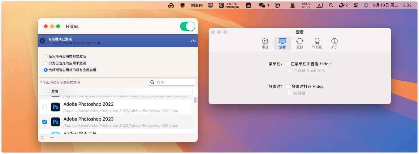 🎯 单一应用专注模式:指定需要保留的「安全应用」(如Excel/Keynote),触发后系统自动过滤其他进程窗口。 -