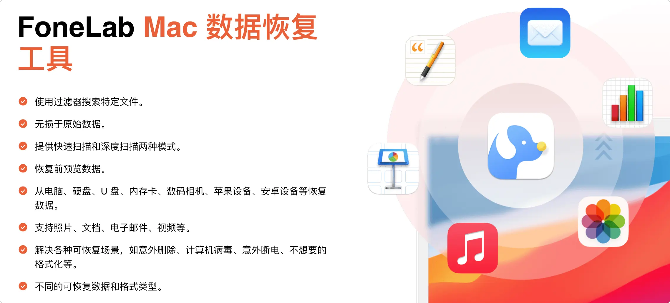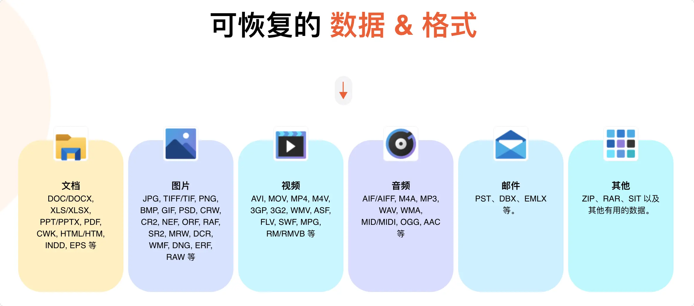📑 全面文件格式支持:支持恢复照片、视频、音频、文档(PDF/Word/Excel)、电子邮件和归档文件等上百种常用文件格式。 -