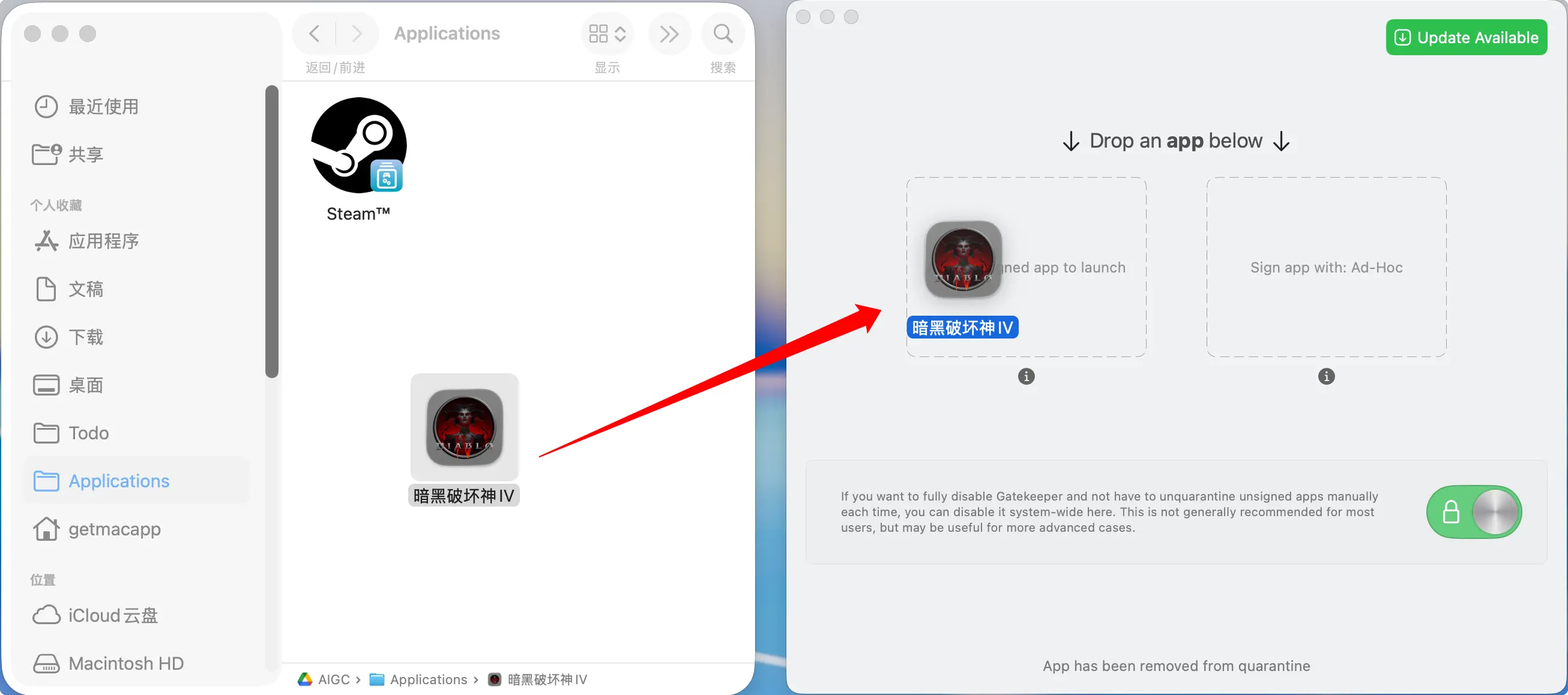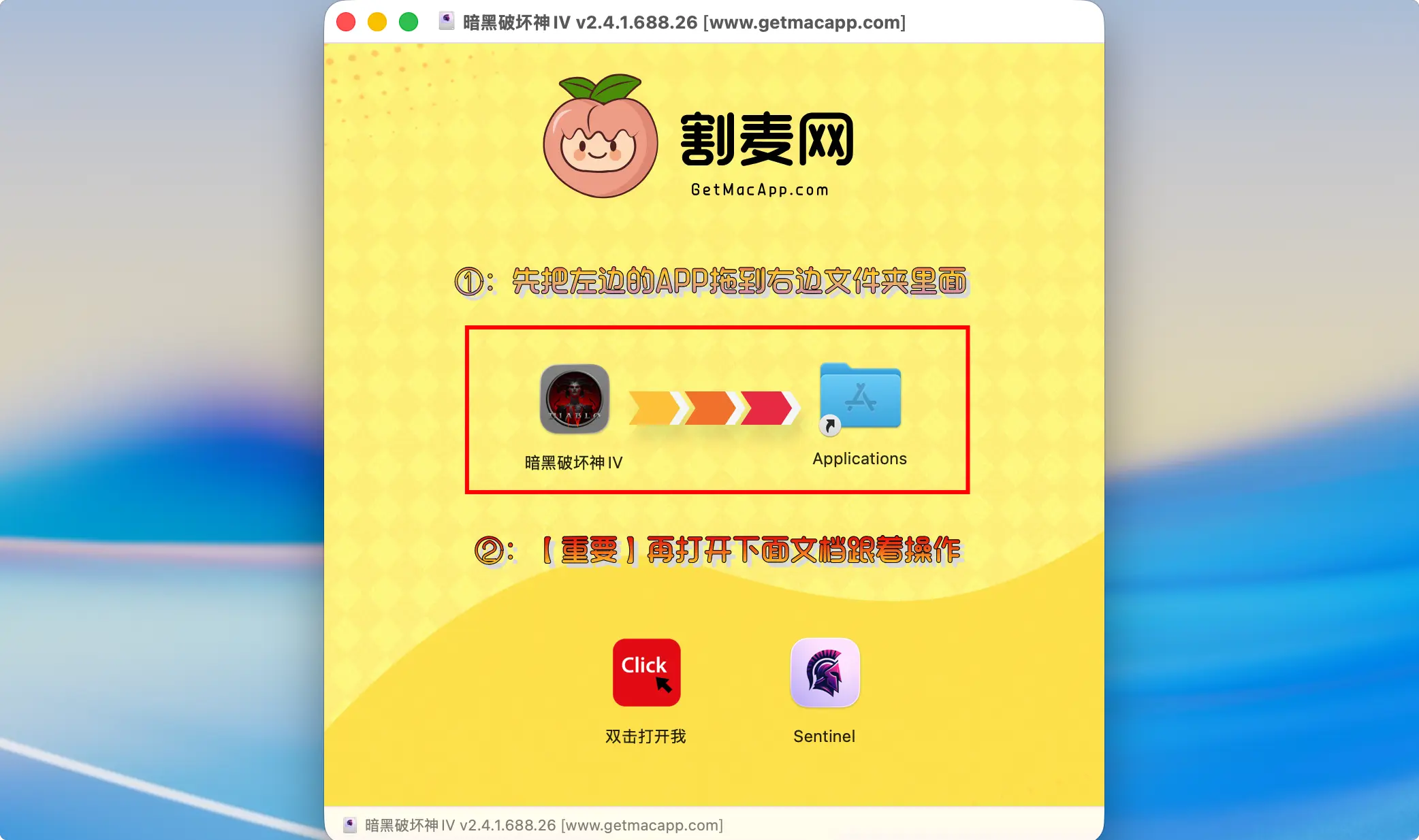 1.拖动左边的暗黑破坏神 IV右边的Applications文件夹里面完成安装