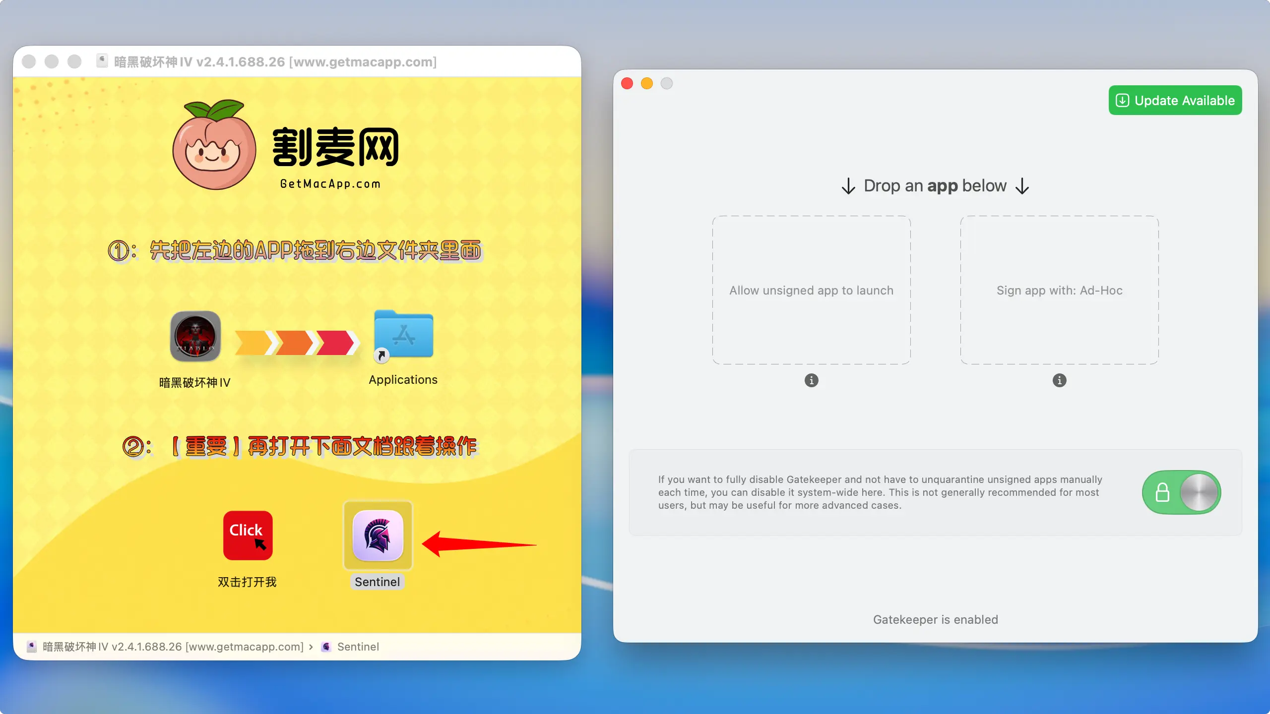 打开访达▸ 应用程序 文件夹【安装位置】找到提示已损坏的游戏APP,并把它拖入Sentinel 界面左侧的框框里面