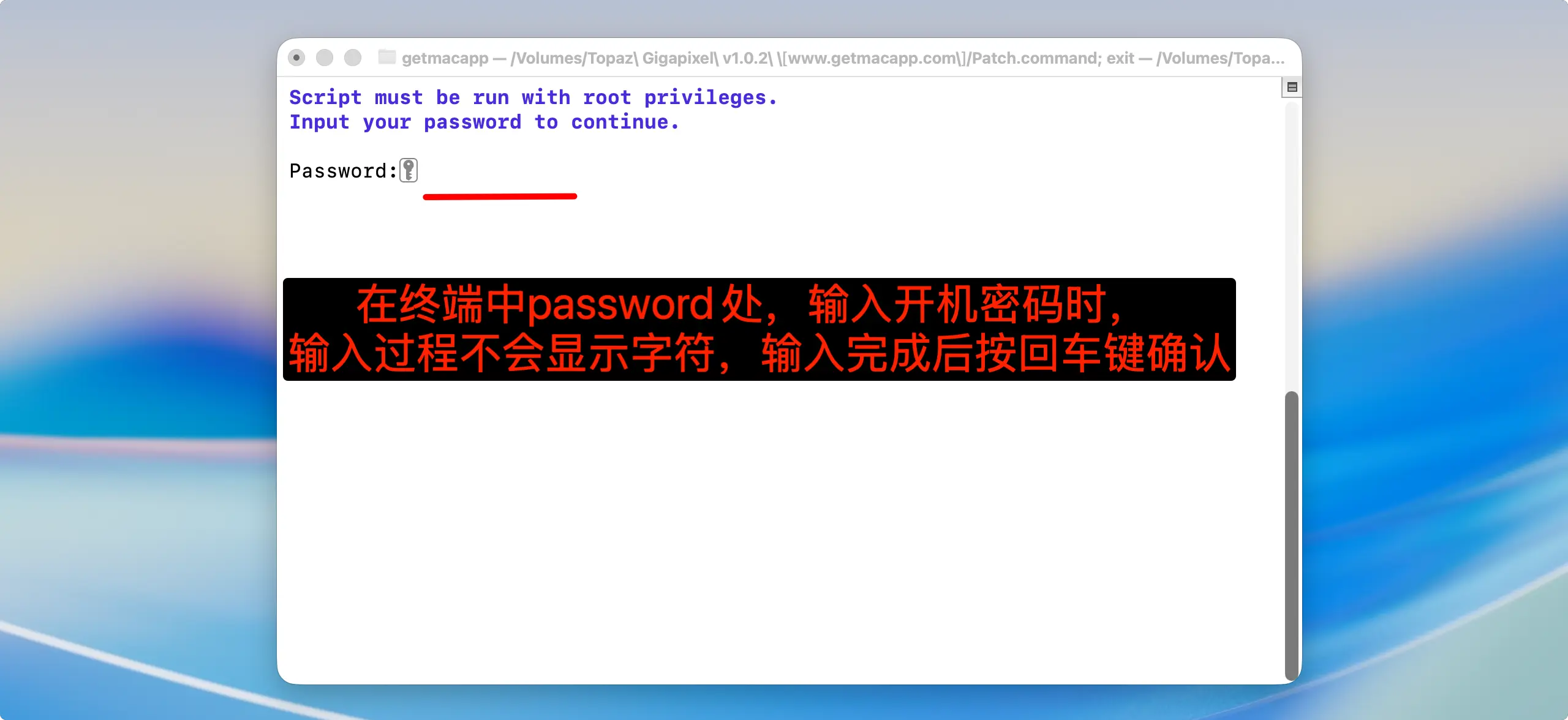 在终端中password处,输入开机密码(锁屏密码)时,输入过程不会显示字符,输入完成后按回车键确认