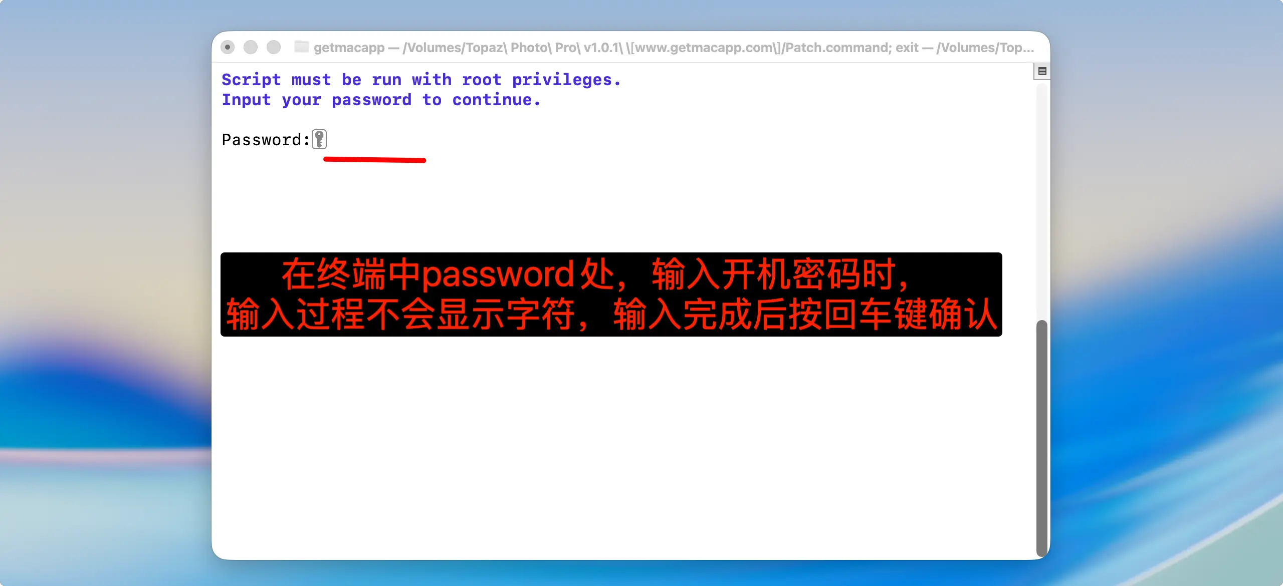 在终端中password处,输入开机密码(锁屏密码)时,输入过程不会显示字符,输入完成后按回车键确认