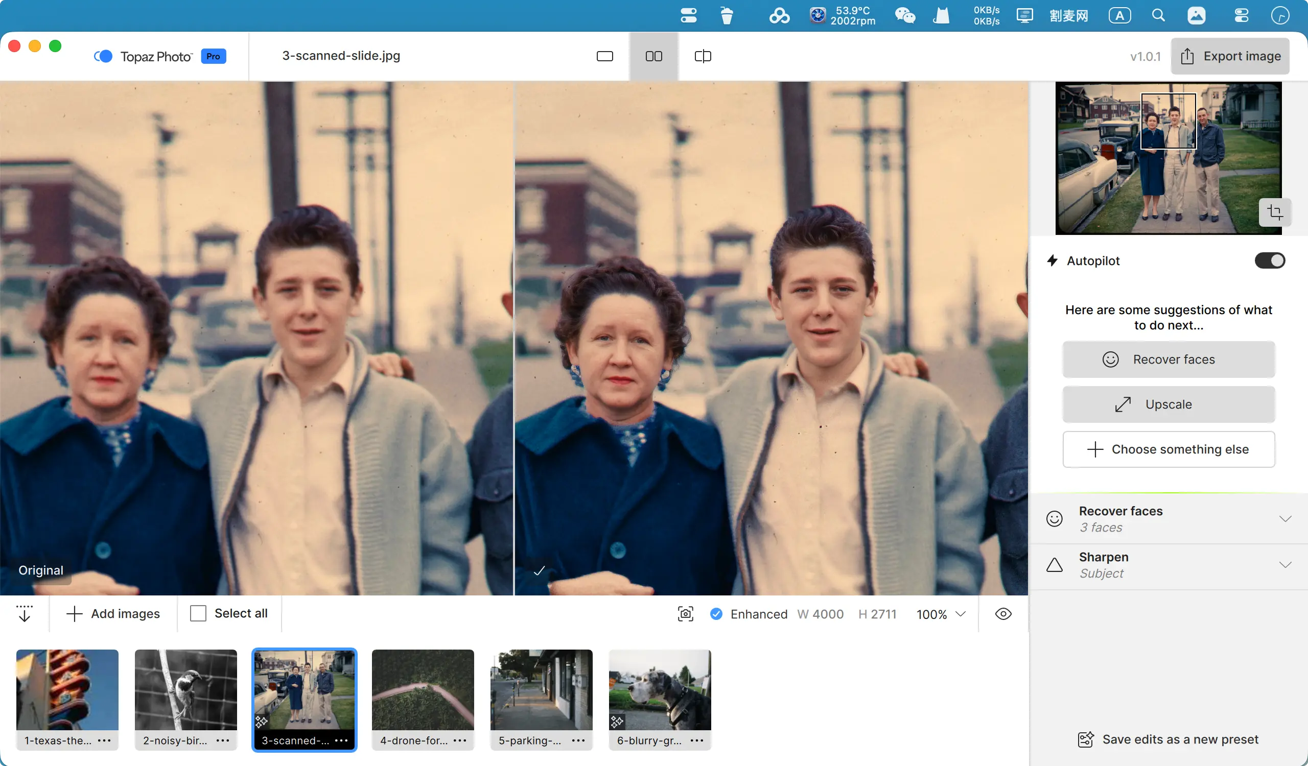 👨🎓 老照片与历史影像修复:处理扫描的老照片时,可先利用降噪功能清除霉斑与颗粒,再结合锐化与放大功能修复模糊人脸并提升分辨率,让珍贵记忆重焕清晰。