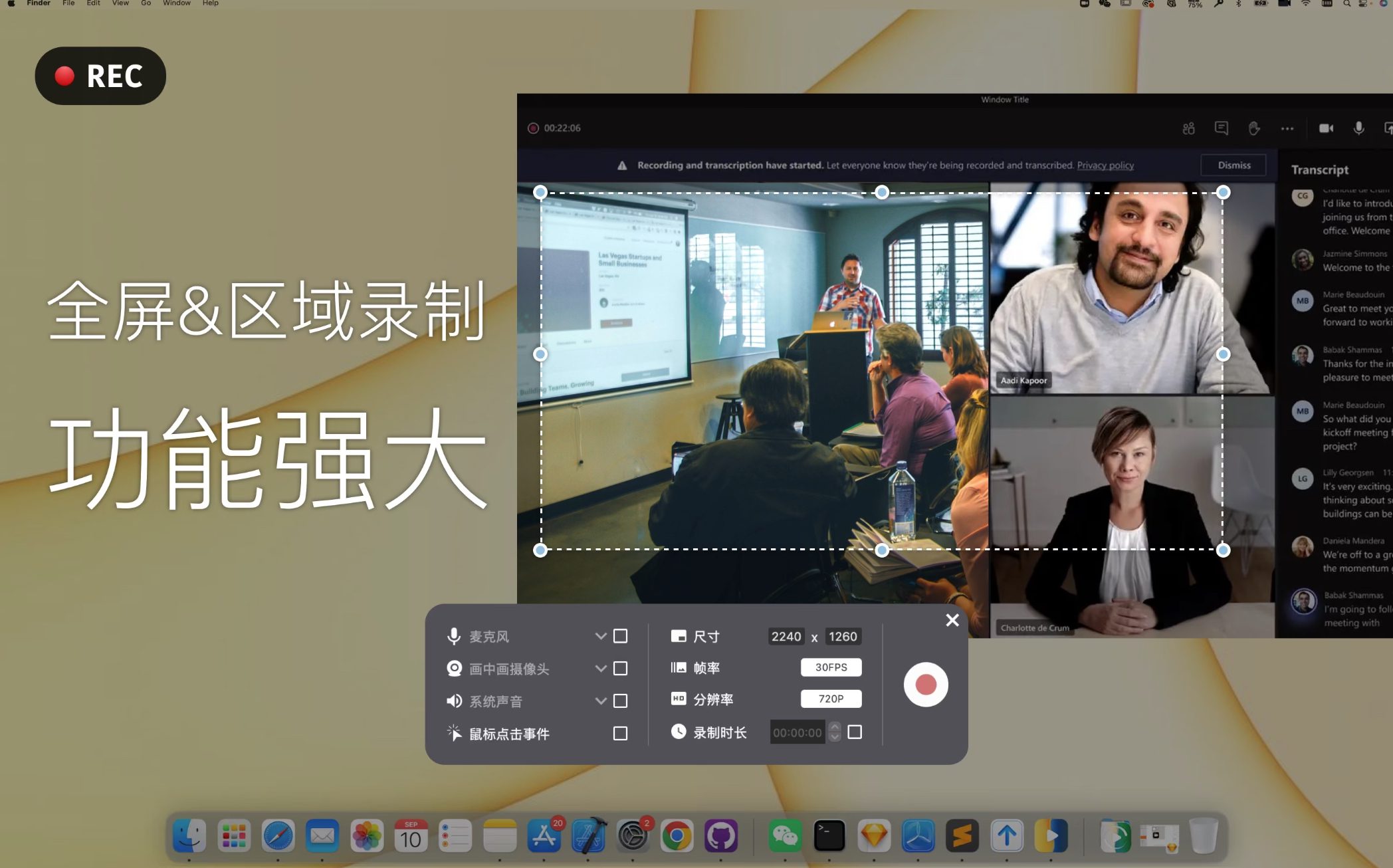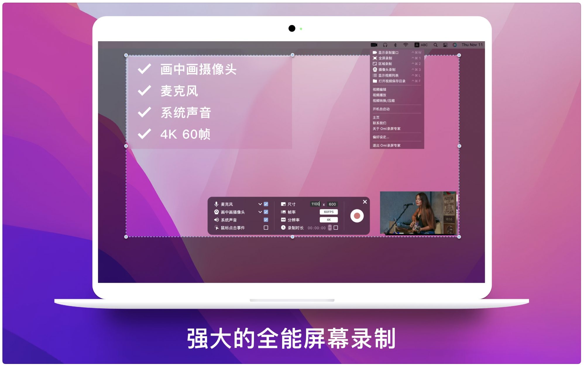 专业影像处理:画中画摄像头位置可拖拽调节,虚拟背景功能(macOS 12.0+)实现绿幕级抠像效果 -