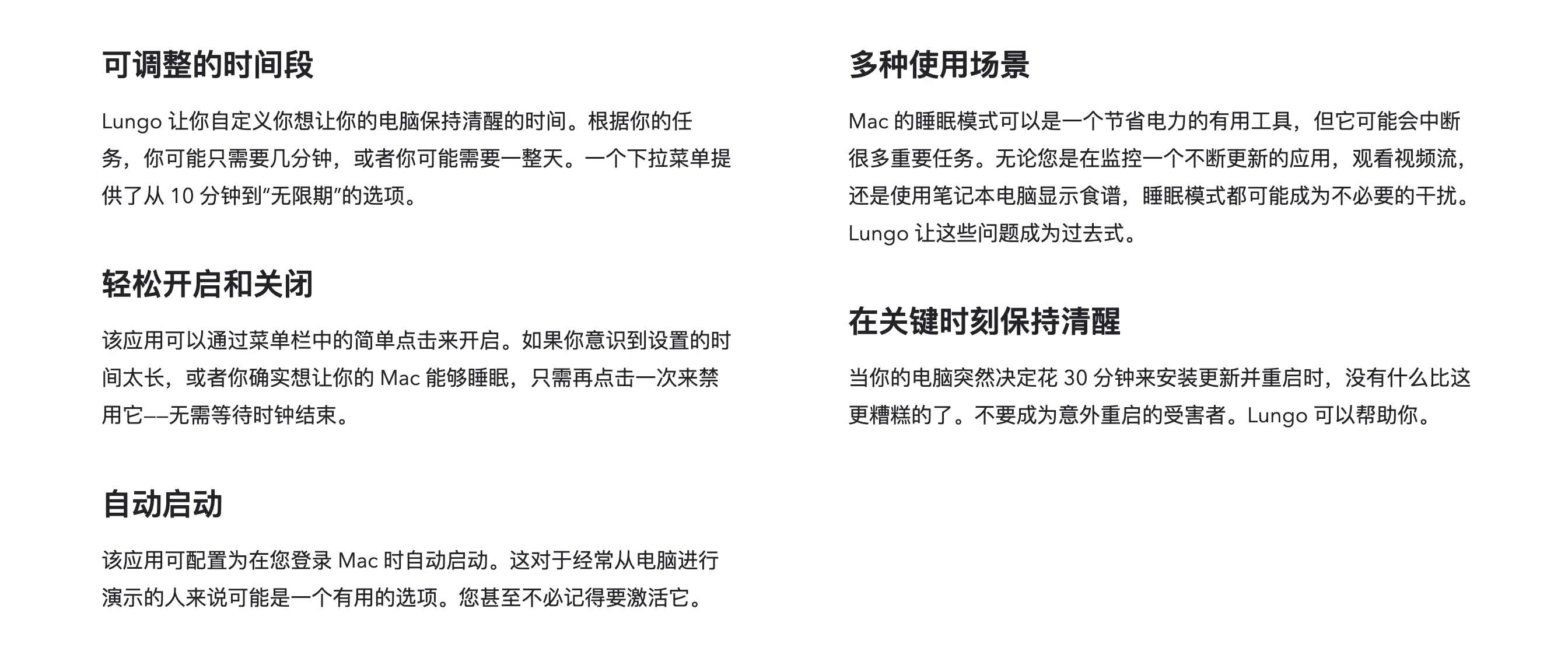 ⏱️ 合盖不休眠,持久力全开! Lungo for Mac 是专为持久任务打造的防休眠神器🔋,彻底终结Mac自动熄屏的打断魔咒!✨ 无论是煲剧非全屏、阅读长文档不滚动,还是合盖跑代码/下载大文件,它都能强制系统保持清醒状态🚦。告别反复晃动鼠标的尴尬,让每一分算力都为您持续输出!