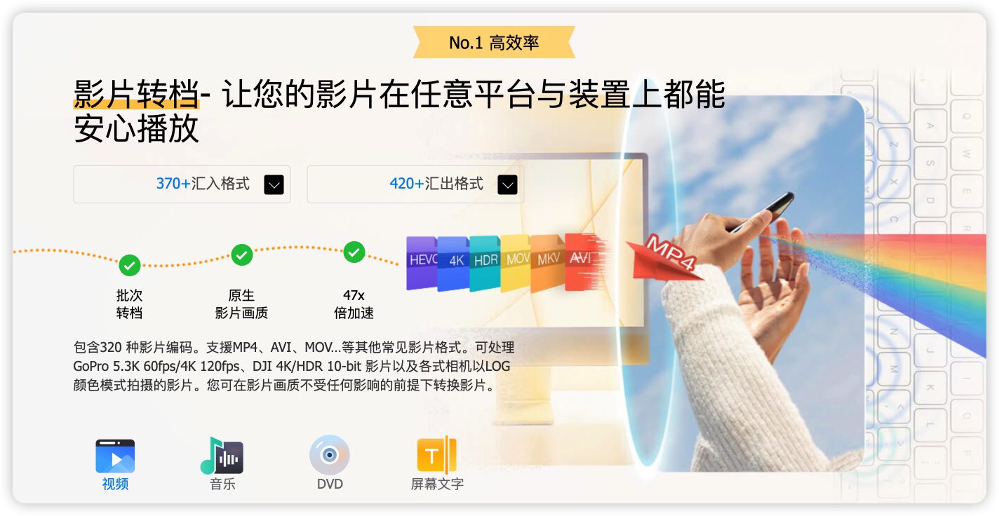 输入支持:MP4/MOV/AVI/MKV等300+格式(含8K/VR视频)