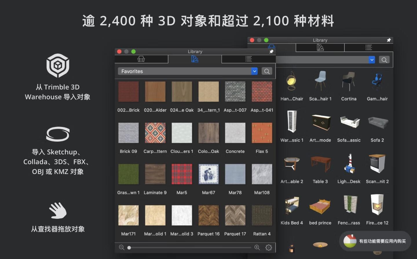 高级物件库:内含3000+参数化门窗、家具及材质模板,支持自定义导入 -