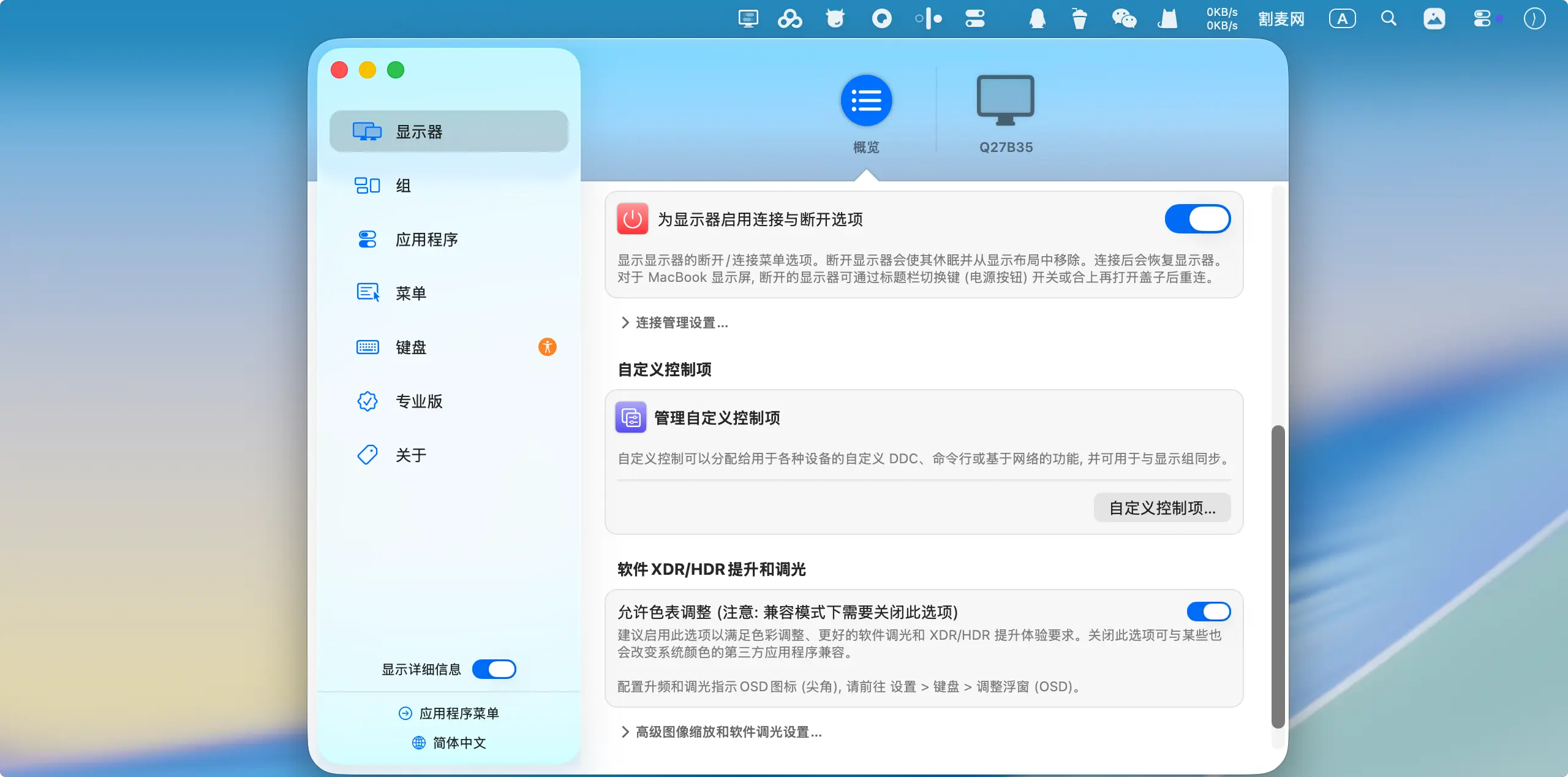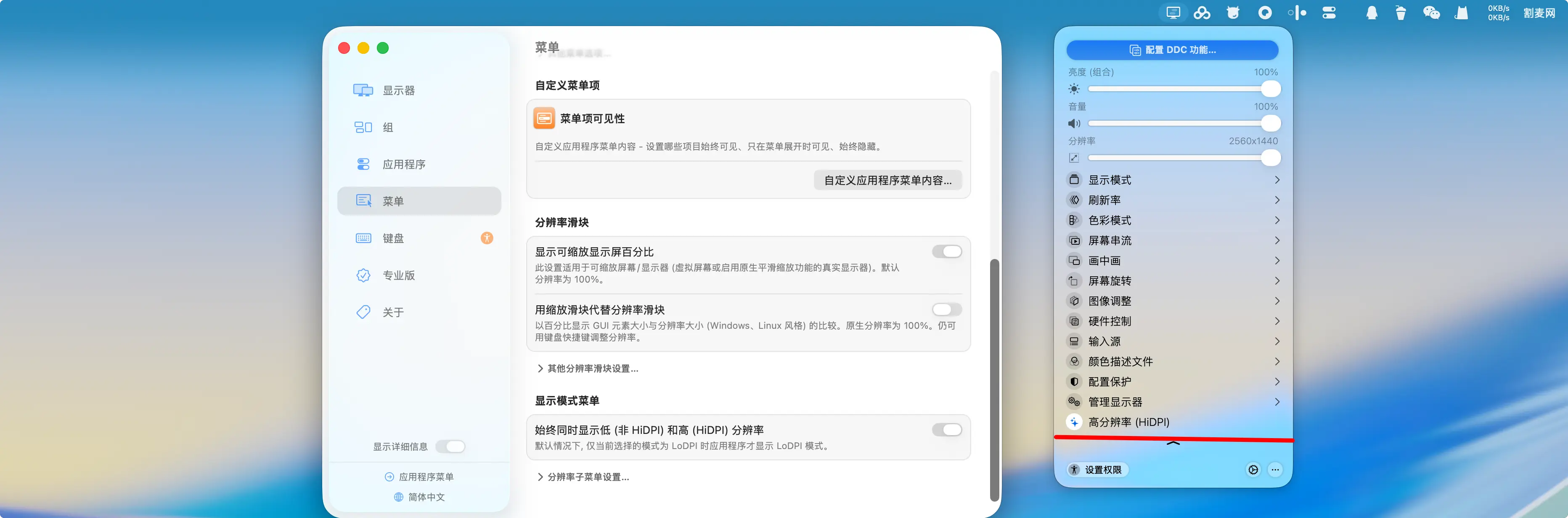 🎨 专业级色彩与亮度管理:提供精细的色温、伽马值和色彩空间调整,并支持通过软件和硬件(DDC)控制亮度、音量甚至颜色,这些调整都能通过菜单栏滑块或自定义快捷键快速完成。 -