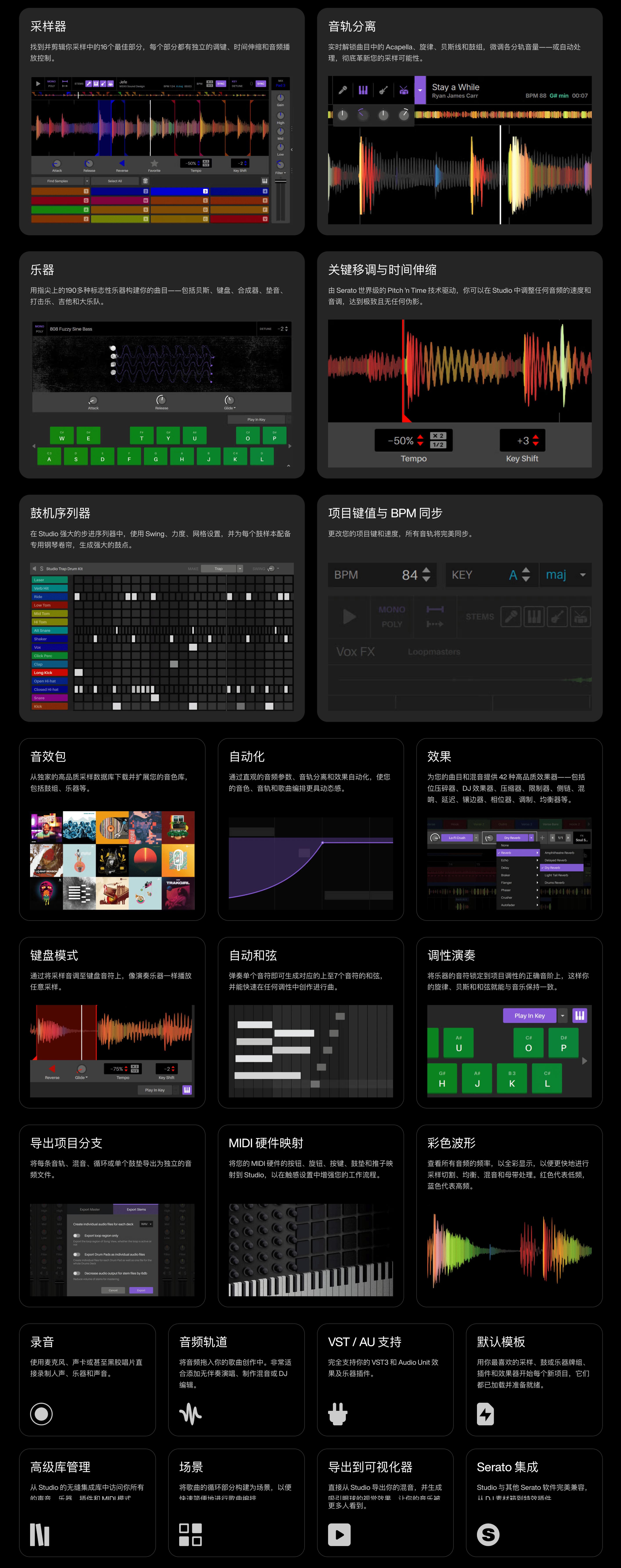 🎧 无缝硬件集成:软件与众多Serato认证的DJ控制器和硬件无缝集成,您可以直接通过硬件控制软件功能,获得更接近现场表演的沉浸式制作体验。 -